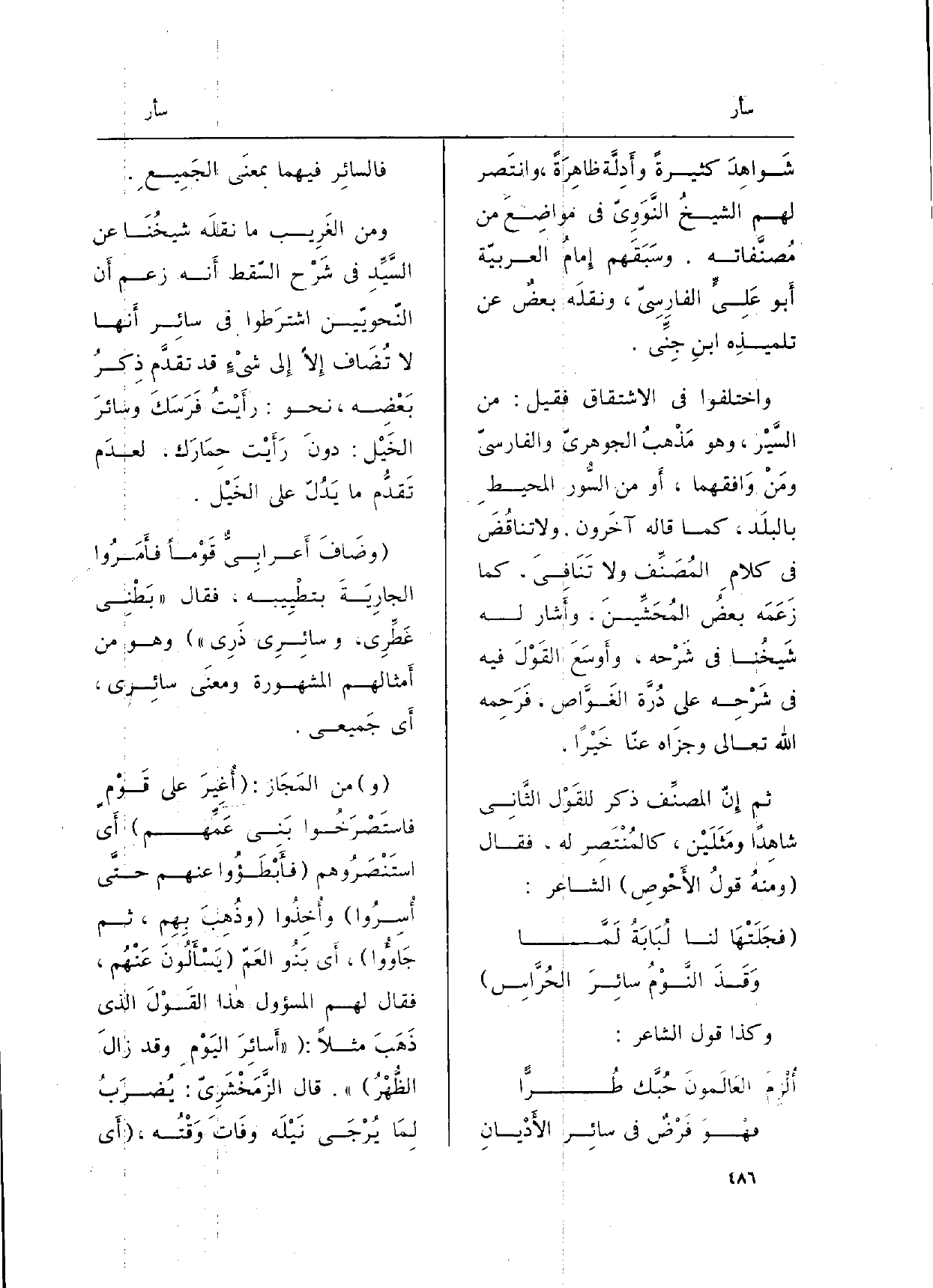 وَمن الغَريب مَا نقلَه شيخُنَا عَن السَّيِّد فِي شَرْح السّقط أَنه زعم أَن النّحويّين اشترَطوا فِي سائِر أَنها لَا تُضَاف إِلّا إِلى شيْءٍ قد تقدَّم ذِكرُ بَعْضهِ، نَحْو: رأَيْتُ فَرَسَكَ} وسائرَ الخَيْل: دونَ رَأَيْت حِمَارَكَ، لعدَم تَقدُّم مَا يَدُلُّ على الخَيْل.