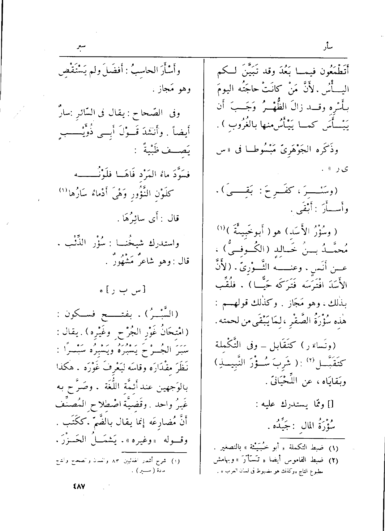 وَفِي الصّحاح: يُقَال فِي السّائرِ: سارٌ أَيضاً، وأَنشدَ قَوْلَ أَبِي ذُؤَيْبٍ يَصِف ظَبْيةً: