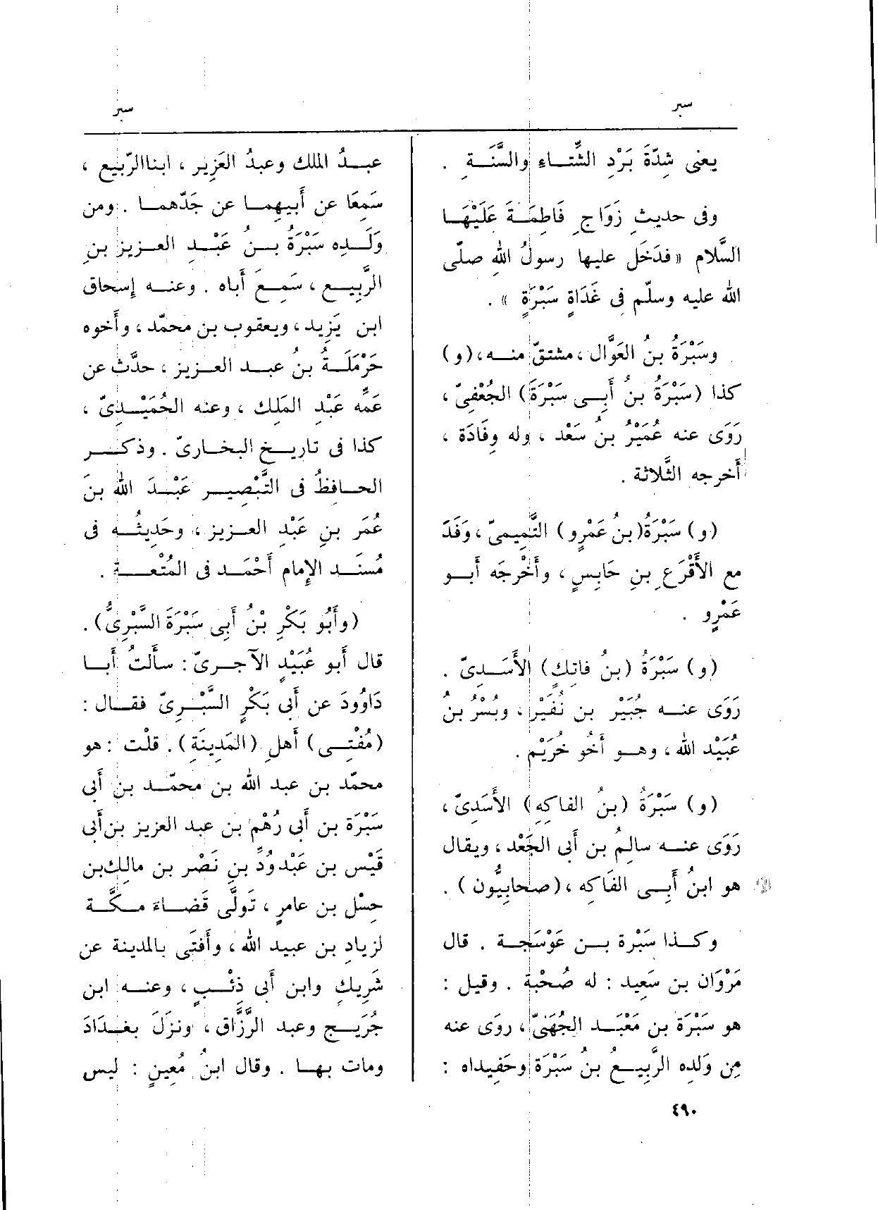 وَكَذَا سَبْرة بن عَوْسَجة. قَالَ مَرْوَان بن سَعِد: لَهُ صُحْبة. وَقيل: هُوَ سَبْرَة بن مَعْبَد الجُهَنيّ، روَى عَنهُ مِن وَلدِه الرَّبِيعُ بنُ سَبْرَةَ وحَفِيداه: عبدُ الْملك وعبدُ العَزِيز، ابْنا الرّبيع، سَمِعَا عَن أَيهِما عَن جَدّهما. وَمن وَلَدِه سَبْرَةُ بنُ عَبْدِ الْعَزِيز بنِ الرَّبِيع، سَمِعَ أَبا. وَعنهُ إِسحاق ابْن يَزِيد، وَيَعْقُوب بن محمّد، وأَخوه حَرْمَلَةُ بنُ عبد الْعَزِيز، حدَّث عَن عَمِّه عَبْدِ المَلِك، وَعنهُ الحُمَيْدِيّ، كَذَا فِي تَارِيخ البخاريّ. وَذكر الحافِظُ فِي التَّبْصِير عَبْدَ الله بنَ عُمَرَ بنِ عَبْدِ الْعَزِيز، وحَدِيثُه فِي مُسنَد الإِمام أَحْمَد فِي المُتْعة.