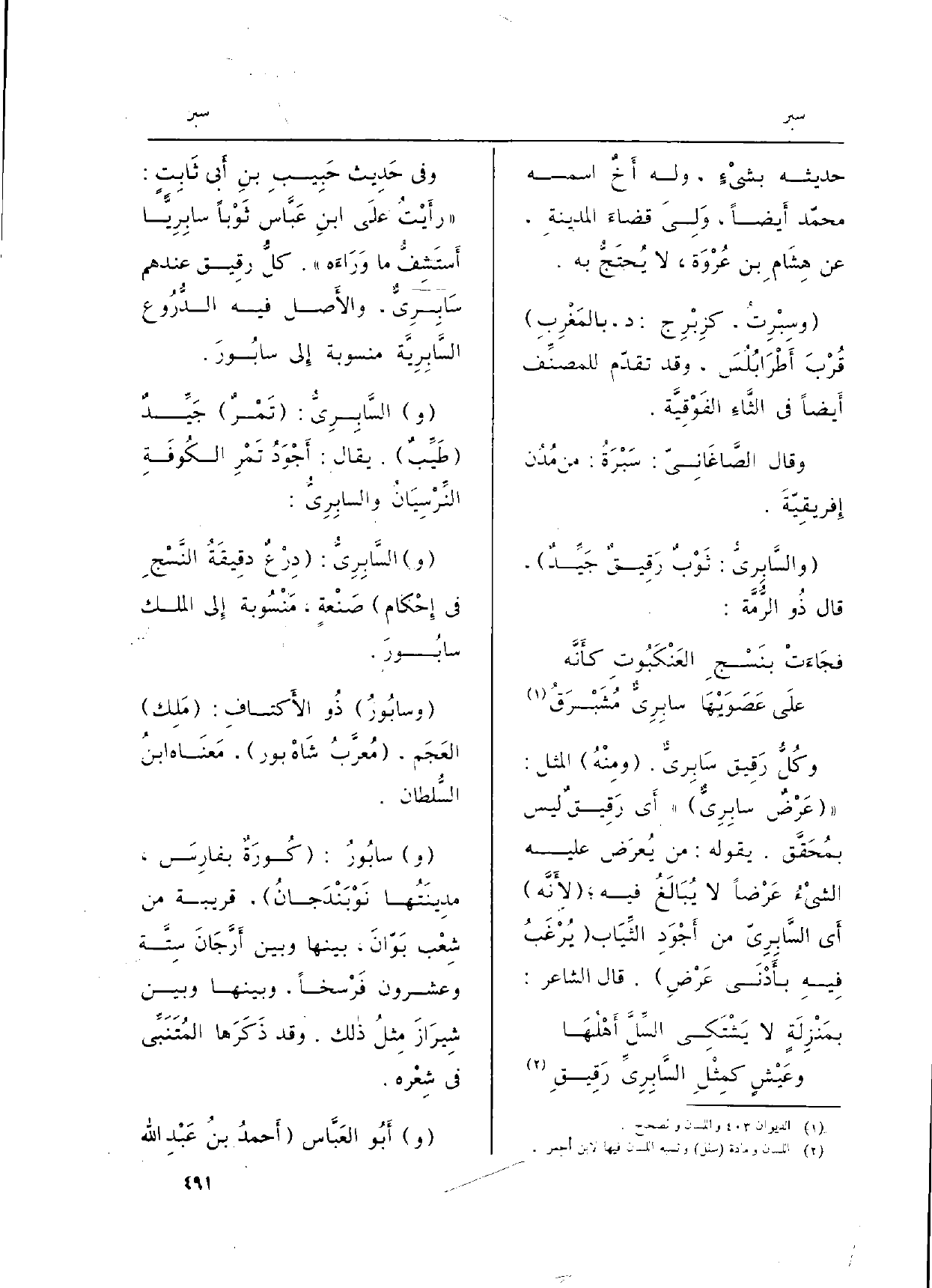 وَفِي حَدِيث حَبِيبِ بنِ أَبِي ثَابِتٍ: (رأَيْتُ علَى ابنِ عَبَّاس ثَوْباً سابِرِيًّا أَستَشِفُّ مَا وَرَاءَه) . كلُّ رقِيق عِنْدهم سَابِرِيٌّ، والأَصل فِيهِ الدُّرُوع السَّابِرِيَّة منسوبة إِلَى سابُورَ.