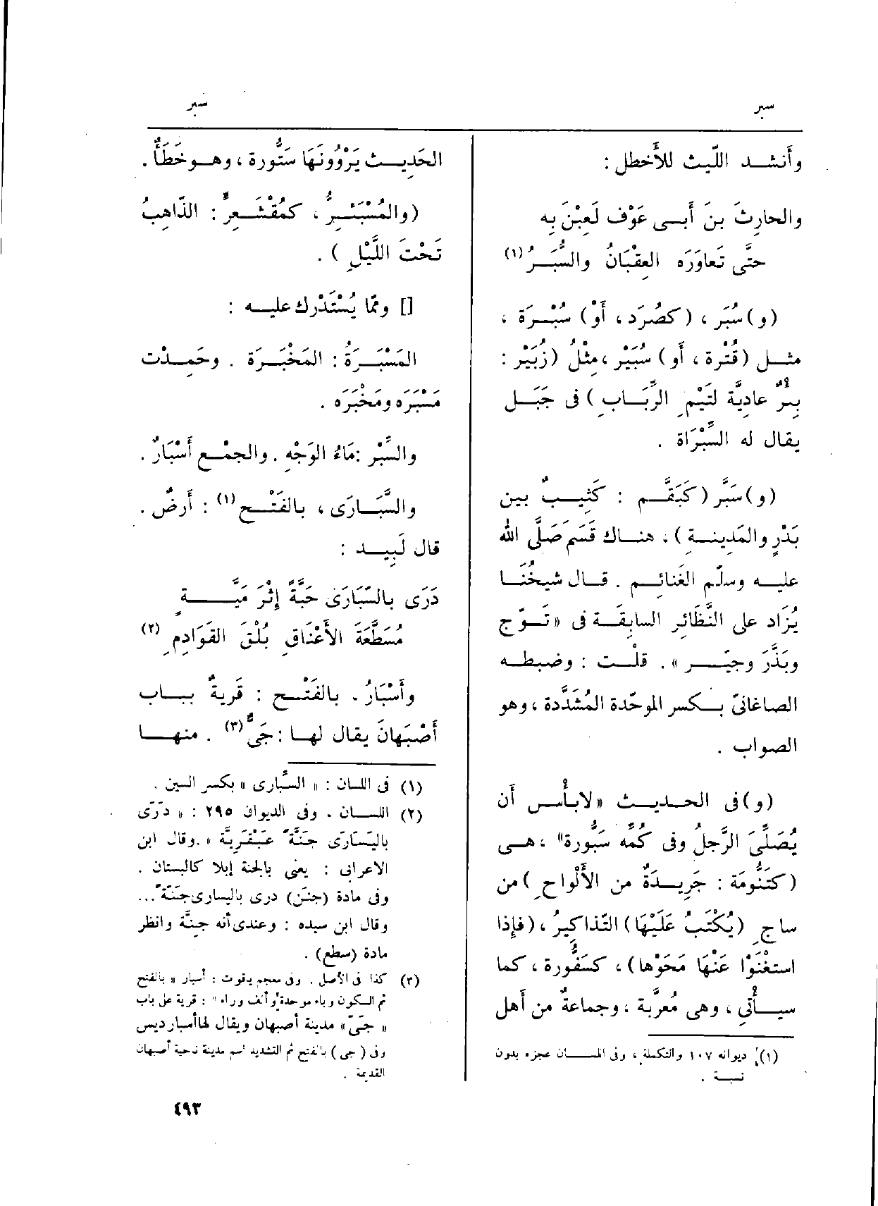 (و) سَبَّر (كَبَقَّم: كَثِيبٌ بَين بَدْرٍ والمَدِينةِ) ، هُنَاكَ قَسَم صلى الله عَلَيْهِ وسلمالغَنائِم. قَالَ شيخُنَا يُزَاد على النَّظَائِر السابِقَة فِي (تَوّج وبَذَّرَ وجيّر) . قلْت: وَضَبطه الصاغانيّ بِكَسْر الموحّدة المُشَدَّدة، وَهُوَ الصَّوَاب.