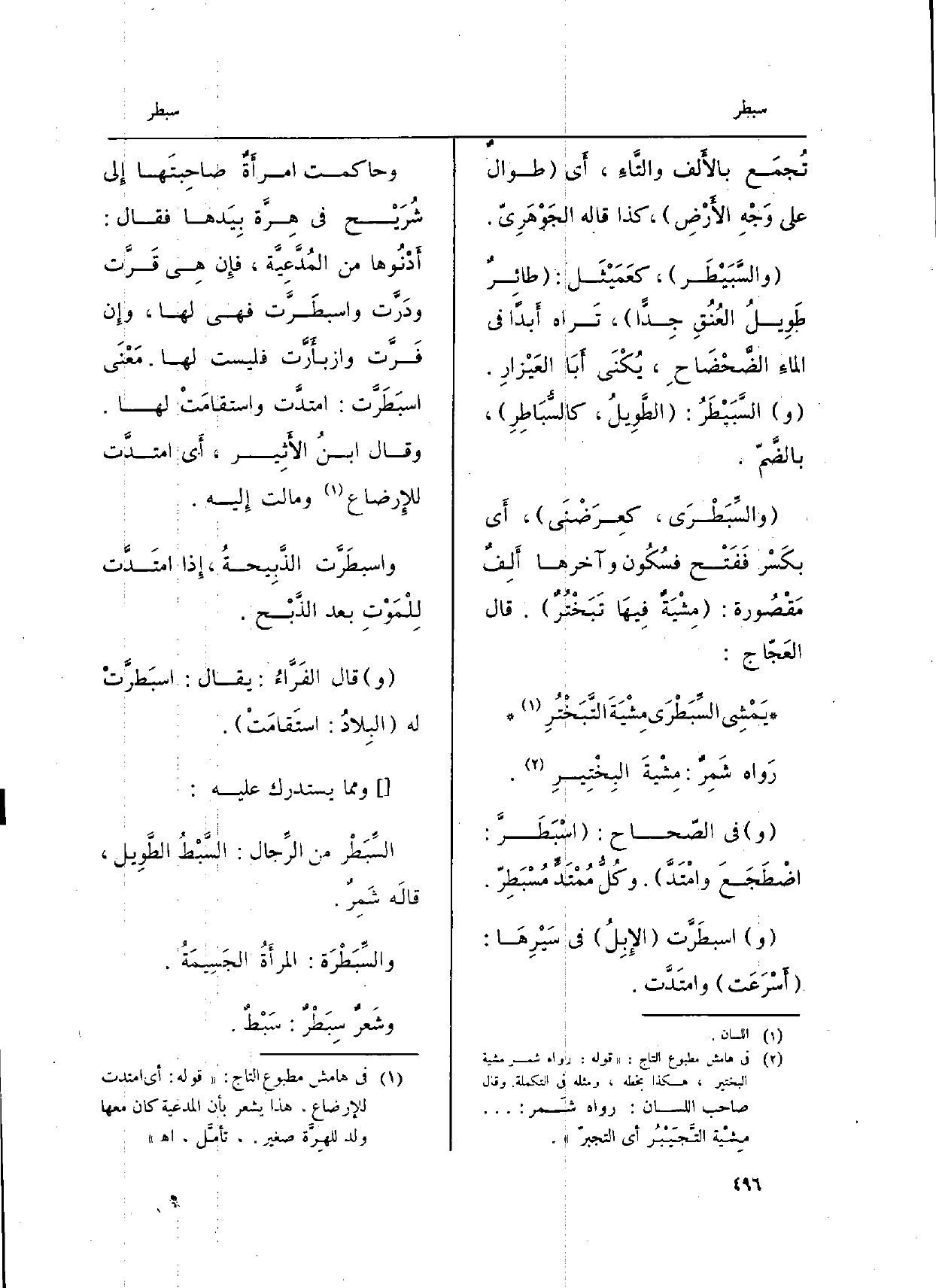 (والسَّبَيْطَر) ، كعَمَيْثَل: (طائِرٌ طَوِيلُ العُنُقِ جِدًّا) ، تَراه أَبداً فِي الماءِ الضَّحْضَاحِ، يُكْنَى أَبَا العَيْزارِ. (و) السَّبَيْطَرُ (الطَّوِيلُ، كالسُّبَاطِرِ) ، بالضَّمّ.
