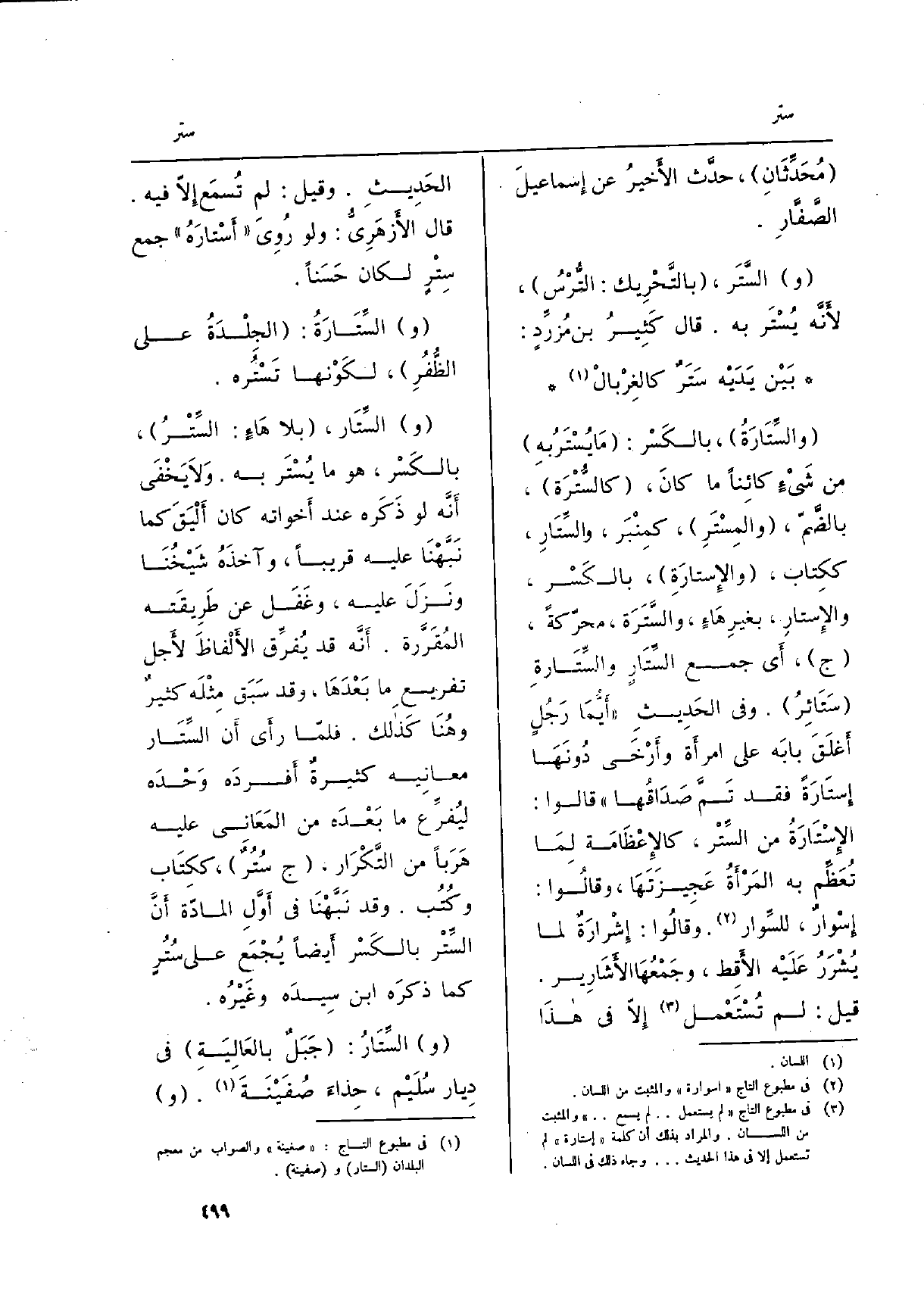 (و) السِّتَار، (بِلَا هاءٍ: السِّتْرُ) ، بالكَسْر، هُوَ مَا يُسْتَر بِهِ. وَلاَ يَخْفَى أَنَّه لَو ذَكَره عِنْد أَخواته كَانَ أَلْيَقَ كَمَا نَبَّهْنَا عَلَيْهِ قَرِيبا، وآخذَهُ شَيْخُنَا ونَزَلَ عَلَيْهِ، وغَفَل عَن طَرِيقَته المُقَرَّرة. أَنَّه قد يُفرِّق الأَلْفاظَ لأَجل تفريعِ مَا بَعْدَهَا، وَقد سَبَق مِثْلَه كثيرٌ وهُنَا كَذالك. فلمّا رأَى أَن السِّتَار معانِيه كثيرةٌ أَفردَه وَحْدعِ ليُفرِّع مَا بَعْدَه من المَعَاني عَلَيْهِ هَرَباً من التَّكْرَار، (ج سُتُرٌ) ، ككِتَاب وكُتُب. وَقد نَبَّهْنَا فِي أَوَّلِ المادّة أَنَّ السِّتْر بالكَسْر أَيضاً يُجْمَع على سُتُرٍ كَمَا ذكرَه ابْن سِيدَه وغَيْرُه.