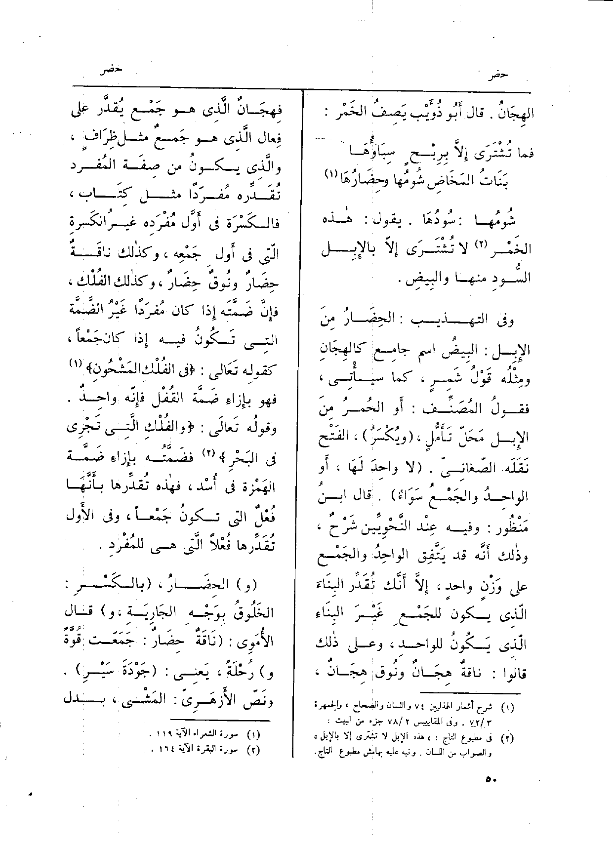 وَفِي التَّهْذِيب: الحِضَارُ مِنَ الإِبِل: البِيضُ اسْم جامِع كالهِجَانِ ومِثْلُه قَوْلُ شَمِرٍ، كَمَا سيأْتِي، فقولُ المُصَنِّف: أَو الحُمرُ مِنَ الإِلل مَحَلّ تَأَمُّلٍ، (ويُكْسَرُ) ، الفَتْح نَقَلَه الصّغانِي. (لَا واحِدَ لَهَا، أَو الواحِدُ والجَمْعُ سَوَاءٌ) . قَالَ ابنُ مَنْظُور: وَفِيه عِنْد النَّحْوِيِّين والجَمْع على وَزْنٍ واحدٍ، إِلاَّ أَنَّك تُقَدِّر البِنَاءَ الّذِي يكون للجَمْعِ غَيْرَ البِنَاءِ الّذِي يَكُونُ للواحدِ، وعَلى ذالك قَالُوا: ناقةٌ هِجَانٌ ونُوق هِجَانٌ، فهِجَانٌ الَّذِي هُوَ جَمْع يُقدَّر على فِعال الَّذِي هُوَ جَمعٌ مثل ظِرَافٍ، والَّذِي يكونُ من صِفَة المُفرد تُقَدِّره مُفرَداً مثل كِتَاب، فالكَسْرَة فِي أَوَّل مُفْرَدِه غيرُ الكَسرةِ الّتي فِي أول جَمْعِه، وكذالك ناقَةٌ حِضَارٌ ونُوقٌ حِضَارٌ، وكذالك الفُلْك، فإِنَّ ضَمَّتَه إِذا كَانَ مُفرَداً غَيْرُ الضَّمَّة التِي تَكُونُ فِيهِ إِذا كَانَ جَمْعاً، كقولِه تَعَالَى: {فِى الْفُلْكِ الْمَشْحُونِ} (الشُّعَرَاء: 119) فَهُوَ بإِزاءِ ضَمَّة القُفْل فإِنّه واحِدٌ. وقولُه تَعالَى: {وَالْفُلْكِ الَّتِى تَجْرِى فِى الْبَحْرِ} (الْبَقَرَة: 164) فضَمَّتُه بإِزاءِ ضَمَّة الهَمْزة فِي أُسْد، فهاذه تُقدِّرها بأَنَّهَا فُعْلٌ الَّتِي تكونُ جَمْعاً، وَفِي الأَول تُقَدِّرها فُعْلاً الَّتي هِيَ للمُفْردِ.