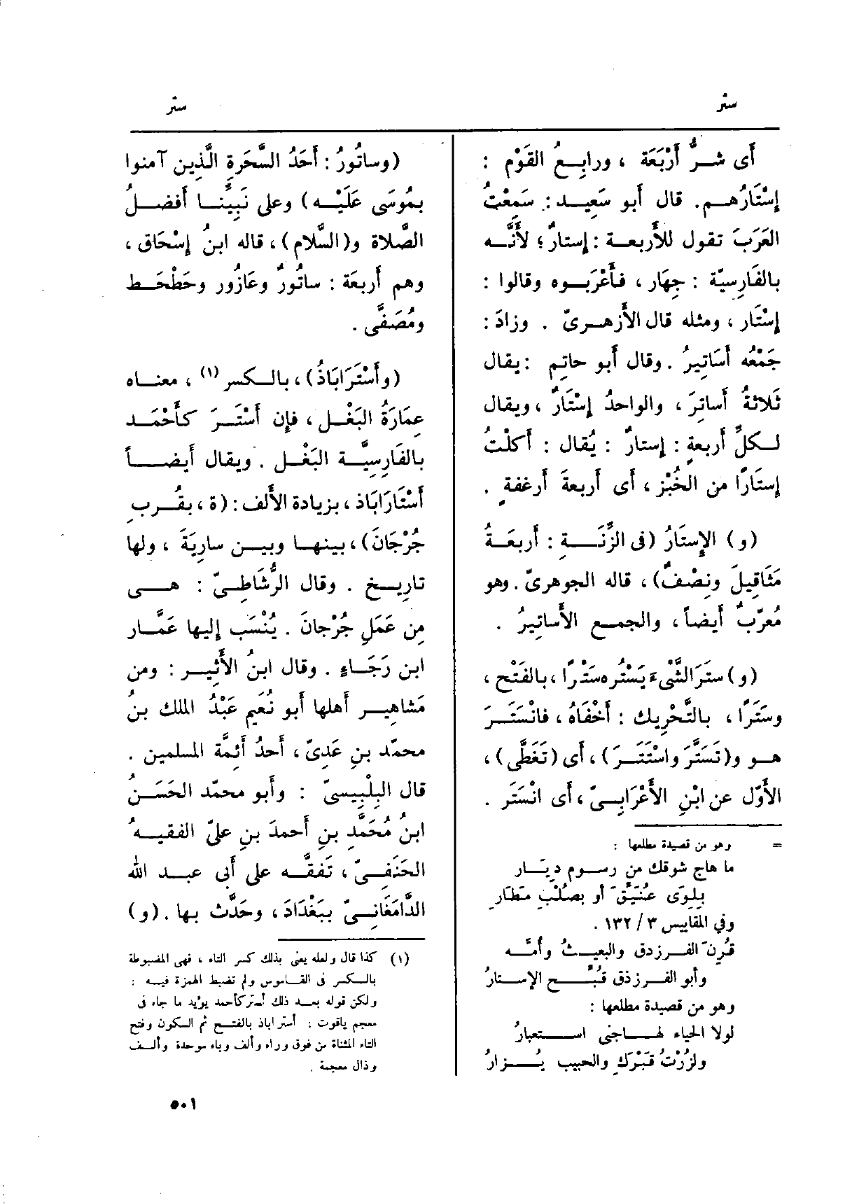 أَي شرُّ أَرْبَعَة، ورابِعُ القَوْم: إِسْتَارُهم. قَالَ أَبو سَعِيد: سَمعْتُ العَرَبَ تَقول للأَربعة: إِستارٌ؛ لأَنَّه بالفَارِسيّة. جِهَار، فأَعْرَبوه وَقَالُوا: إِسْتَار، وَمثله قَالَ الأَزهريّ. وزادَ: جَمْعُه أَسَاتِيرُ. وَقَالَ أَبو حاتِم: يُقَال ثَلاَثَةُ أَساتِرَ، والواحدُ أَسْتَارٌ، وَيُقَال لكلِّ أَربعة: إِستارٌ، يُقال: أَكلْتُ إِستَاراً من الخُبْز، أَي أَربعةَ أَرغفة.
