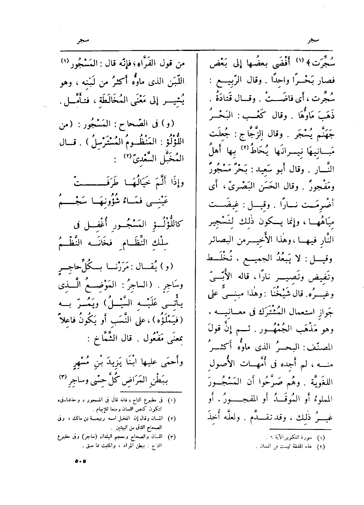 سُجّرَتْ} (التكوير: 6) أَفْضَى بعضُها إِلى بَعْض فَصَارَ بَحْراً واحِداً. وَقَالَ الرّبِيع: سُجِّرت، أَي فاضَتْ. وَقَالَ قَتادَةُ. ذَهَبَ مَاؤُهَا. وَقَالَ كَعْب: البَحْرُ جَهَنَّم يُسْجَر. وَقَالَ الزَّجَّاج: جُعِلَت مَبانِيهَا نِيرانَها يُحَاطُ بِها أَهْلُ النَّار. وَقَالَ أَبو سَعِيد: بَحْرٌ مَسْجُورٌ ومَفْجُورٌ. وَقَالَ الحَسَن البَصْريّ، أَي أُضْرِمَت نَارا. وقِيل: غِيضَت مِيَاهُها، وإِنما يكون ذالِك لِتَسْجِير النَّارِ فِيهَا، وهاذا الأَخِير من البصائر وَقيل: لَا يَبعُدُ الْجَمِيع، تُخْلَط وتَفِيض وتَصِير نَارا، قَالَه الأَبّيّ وغيرُه. قَالَ شَيْخُنَا: وهاذا مبنِيٌّ على جَوازِ اسْتِعْمَال المُشْتَرَك فِي معانِيه، وَهُوَ مَذْهَب الجُمْهُور. ثمَّ إِنَّ قولَ المصنّف: البحرُ الَّذِي ماؤُه أكثرُ مِنْهُ، لم أَجِده فِي أُمَّهات الأُصولِ اللغَويَّة. وهُم صَرَّحُوا أَن المَسْجُورَ المملوءُ أَو المُوقَدُ أَو المفجورُ. أَو غيرُ ذالِك، وَقد تقدَّم. ولعلَّه أُخِذَ من قَول الفَرَّاءِ؛ فإِنّه قَالَ: المَسْجُور اللّبَن الَّذِي ماؤُه أَكثرُ من لَبَنِه، وَهُوَ يُشِير إِلى مَعْنَى المُخَالَطَةِ، فتأَمَّل.