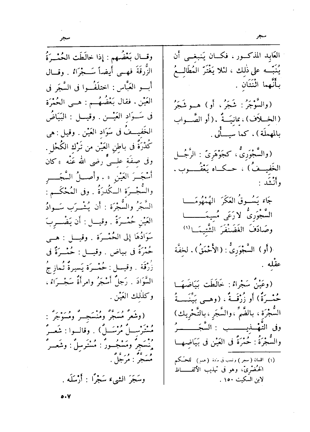 (وعَيْنٌ سَجْرَاءُ: خَالَطَت بَيَاضَهَا حُمْرَةٌ) أَو زُرْقَةٌ، (وَهِي بَيِّنَةُ السُّجْرَةِ، بالضَّمِّ، والسَّجَرِ، بالتَّحْرِيك) وَفِي التَّهْذِيب: السَّجَرُ والشُّجْرَةُ: حُمْرَةٌ فِي العَيْن فِي بَيَاضِها وَقَالَ بَعْضُهم: إِذا خالَطَت الحُمْرَةُ الزُّرقَةَ فَهِيَ أَيضاً سَجْرَاءُ. وَقَالَ أَبو العَبَّاس: اختلَفُوا فِي السَّجَر فِي العَيْن، فَقَالَ بَعْضُهُم: هِيَ الحُمْرَة فِي سَوَادِ العَيْن. وَقيل: البَيَاضُ الخَفِيفُ فِي سَوَادِ العَيْن. وَقيل: هِيَ كُدْرَةٌ فِي باطِنِ العَيْن من تَرْكِ الكُحْلِ. وَفِي صِفَةِ عَلِيَ رَضِي الله عَنْه (كَانَ أَسْجَرَ العَيْنِ) ، وأَصلُ السَّجَرِ والسُّجْرَةِ الكُدرَةُ. وَفِي المُحْكَم: السَّجَرُ والسُّجْرَة: أَن يُشْرَب سَوادُ العَيْنِ حُمْرَةً. وَقيل: أَن يَضْرِبَ سَوَادُهَا إِلى الحُمْرَة. وَقيل: هِيَ حُمْرَةٌ فِي بَيَاض. وَقيل: حُمْرَةٌ فِي زُرْقَة. وَقيل: حُمْرَة يَسيرةٌ تُمازِجُ السَّوَادَ. رَجلٌ أَسْجَرُ وامرأَةٌ سَجْرَاءُ، وكذالِك العَيْن.