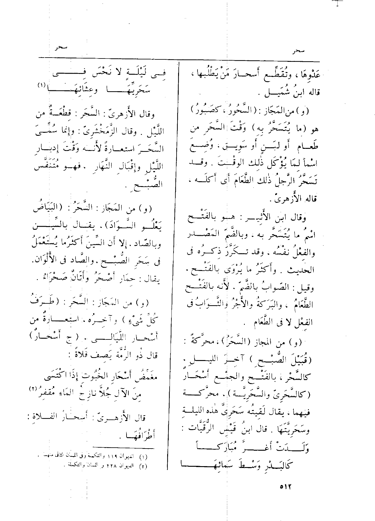 (و) من الْمجَاز (السَّحَرُ) ، محرَّكةً: (قُبَيْلَ الصُّبْحِ) آخِرَ الليلِ، كالسَّحْر، بالفَتْح والجمْع أَسْحَارٌ (كالسَّحَرِيّ والسَّحَرِيَّة) ، محرَّكة فيهمَا، يُقَال لَقِيتُه سَحَرِيَّ هاذه الليلةِ وسَحَرِيَّتَها، قَالَ ابنُ قَيْسِ الرُّقَيَّات: