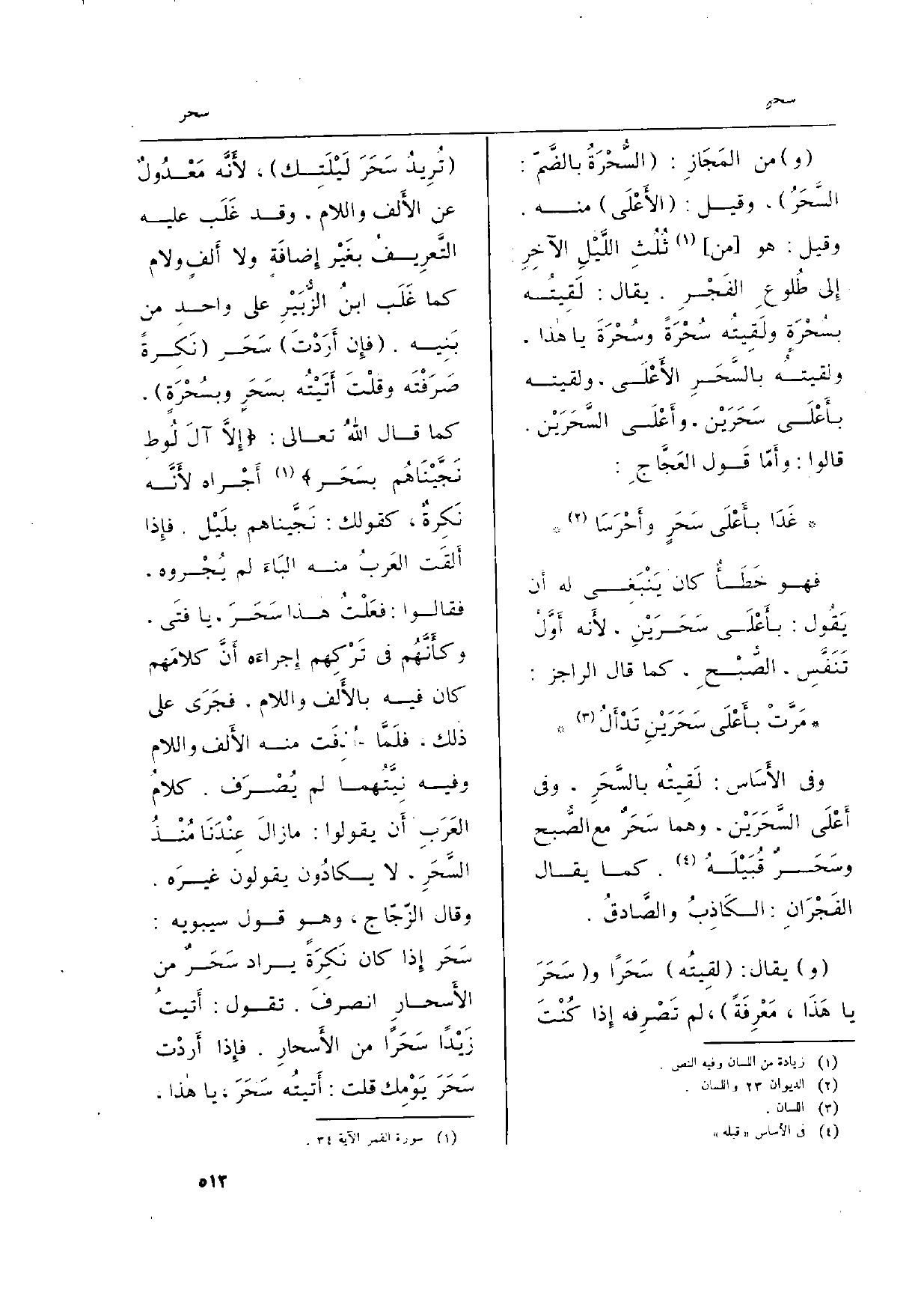 وَفِي الأَسَاس: لَقِيتُه بالسَّحَرِ، وَفِي أَعْلَى السَّحَرَيْن، وهما سَحَرٌ مَعَ الصُّبح وسَحَرٌ قُبَيْلَهُ. كَمَا يُقَال الفَجْرَانِ: الكَاذِبُ والصَّادقُ.