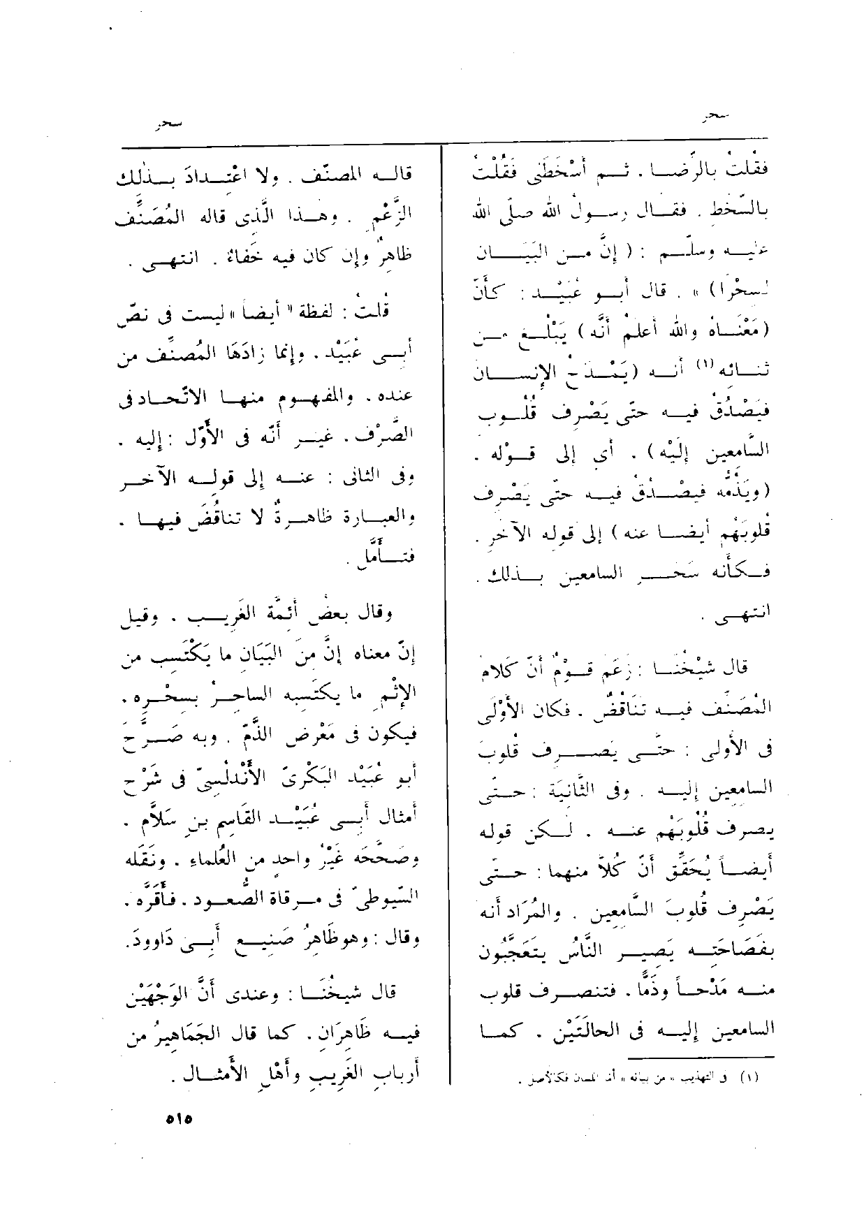 وَقَالَ بعضُ أَئِمَّة الغَرِيب، وَقيل إِنّ مَعْنَاهُ إِنَّ مِنَ البَيَانِ مَا يَكْتَسِب من الإِثْمِ مَا يَكتَسِبه الساحِرُ بسِحْرِه، فَيكون فِي مَعْرض الذَّمّ. وَبِه صَرَّحَ أَبو عُبَيْد البَكْريّ الأَنْدَلُسِيّ فِي شَرْح أَمثال أَبِي عُبَيْد القَاسِم بنِ سَلَّام، وصَحَّحَه غَيْرُ واحدٍ من العُلماءِ، ونَقَله السّيوطيّ فِي مرقاة الصُّعود، فأَقَرَّه، وَقَالَ: وَهُوَ ظَاهِرٌ صَنِيع أَبِي دَاوودَ.