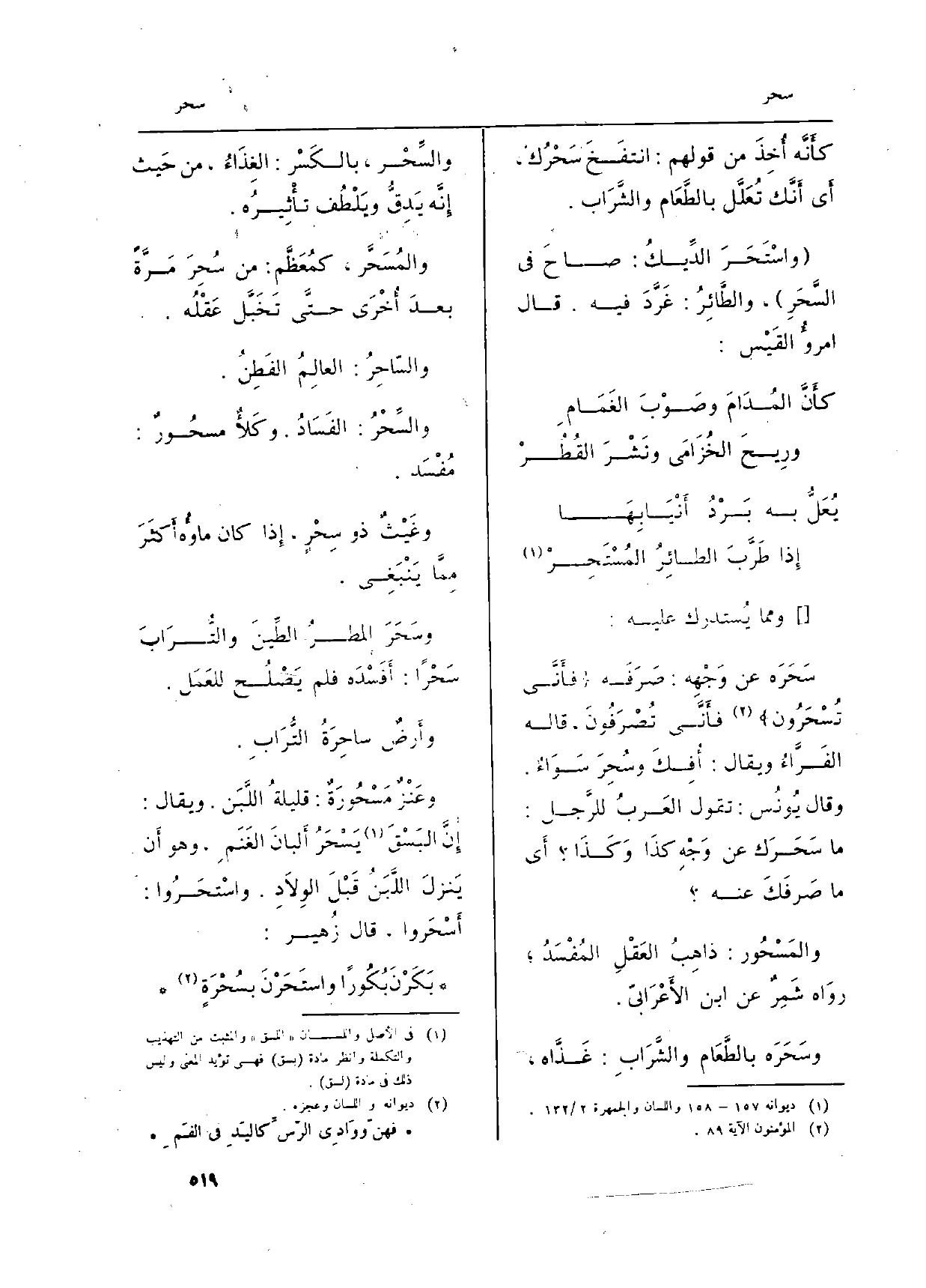 سَحَرَه عَن وَجْهِه: صَرَفَه {فَأَنَّى تُسْحَرُونَ} (الْمُؤْمِنُونَ: 89) فأَنَّى تُصْرَفُونَ، قَالَه الفَرَّاءُ وَيُقَال: أُفِكَ وسُحِرَ سَوَاءٌ. وَقَالَ يُونُس: تَقول العَربُ للرَّجل: مَا سَحَرَك عَن وَجْهِ كذَا وَكَذَا؟ أَي مَا صَرَفَكَ عَنهُ؟