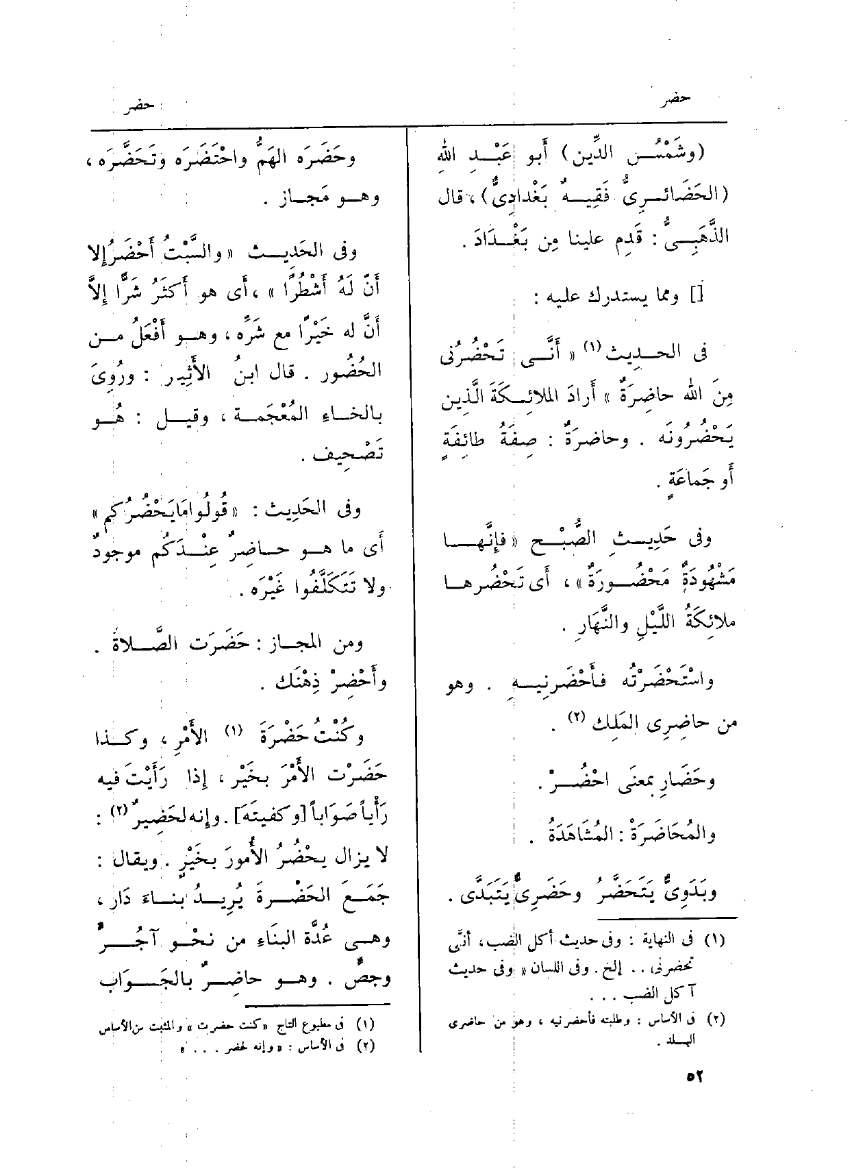 فِي الحَدِيث (أَنَّى تَحْضُرُني مِنَ الله حاضِرَةٌ) أَرادَ الملائِكَةَ الَّذِين يَحْضُرُونَه. وحاضرَةٌ: صِفَةُ طائِفَةٍ أَو جَماعَةٍ.