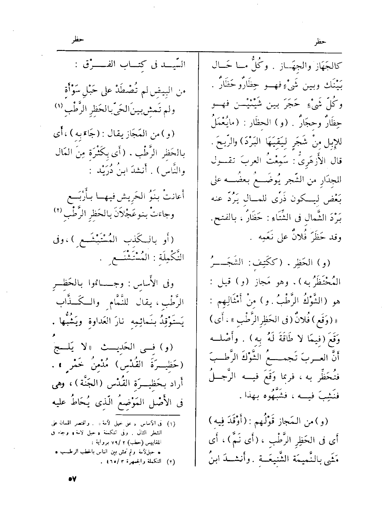 (و) من المَجَاز يُقَال: (جَاءَ بِهِ) ، أَي بالحَظِر الرَّطْب، (أَي بِكَثْرَةٍ مِنَ المَال والنَّاس) . أَنشدَ ابنُ دُرَيْد:
