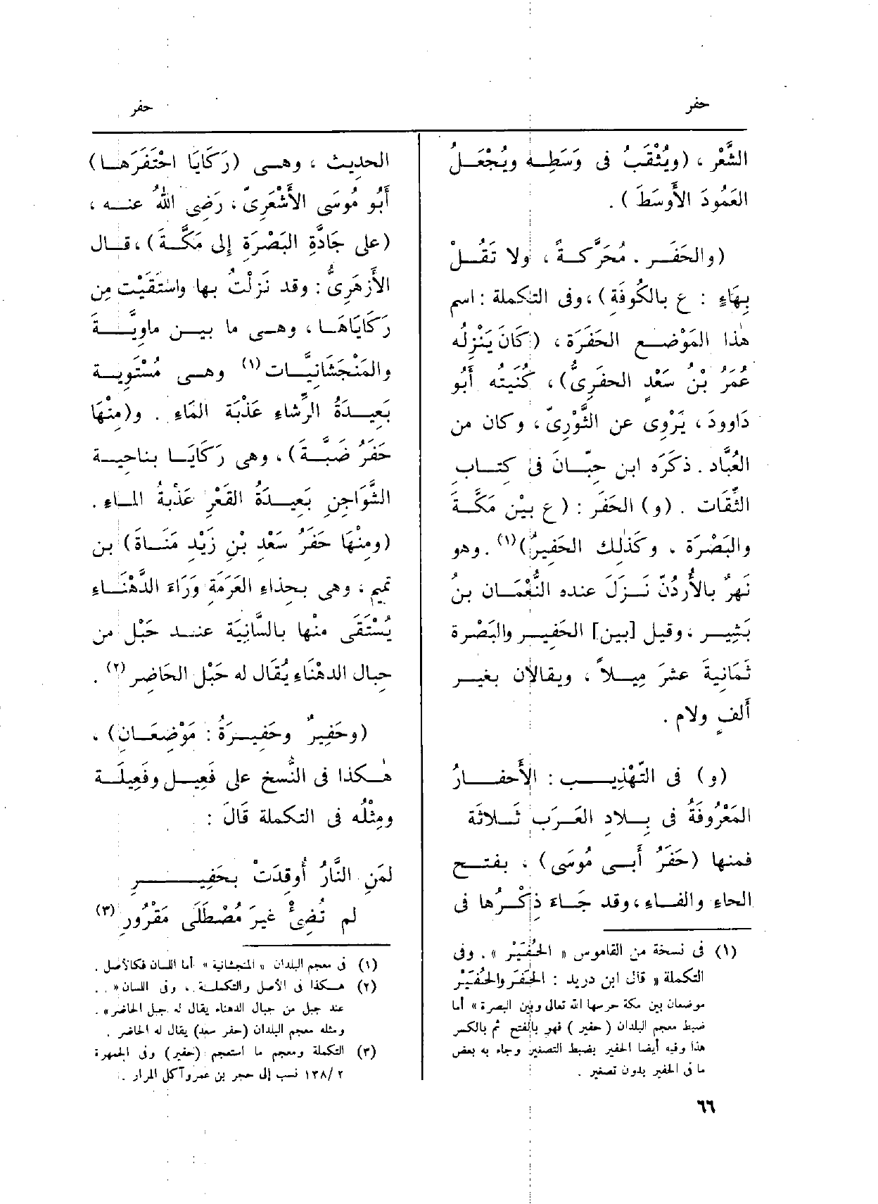 (و) فِي التّهْذِيب: الأَحفارُ المَعْرُوفَةُ فِي بِلادِ العَرَب ثَلاثَة فَمِنْهَا (حَفَرُ أَبي مُوسَى) ، بِفَتْح الحاءِ والفاءِ، وَقد جَاءَ ذِكْرُها فِي الحَدِيث، وَهِي (رَكعايَا احْتَفَرَها) أَبُو مُوسَى الأَشْعَرِيّ، رَضِي اللَّهُ عَنهُ، (على جَادَّةِ البَصْرَةِ إِلى مَكَّةَ) ، قَالَ الأَزهَرِيُّ: وَقد نَزلْتُ بهَا واستَقَيْت مِن رَكَايَاهَا، وَهِي مَا بَين ماوِيَّةَ والمَنْجَشَانِيَّات وَهِي مُسْتَوِية بَعِيدَةُ الرِّشاءِ عَذْبَة المَاءِ. و (مِنْهَا حَفْرُ ضَبَّةَ) ، وَهِي رَكَايَا بناحِية الشَّوَاجِنِ بَعِيدَةُ القَعْرِ عَذْبةُ الماءِ. (ومِنْهَا حَفَرُ سَعْدِ بْنِ زَيْدِ مَنَاةَ) بن تَمِيم، وَهِي بحِذاءِ العَرَمَةِ وَرَاءَ الدَّهْنَاءِ يُسْتَقَى منْها بالسَّانِيَة عِنْد حَبْل الحَاضِر.