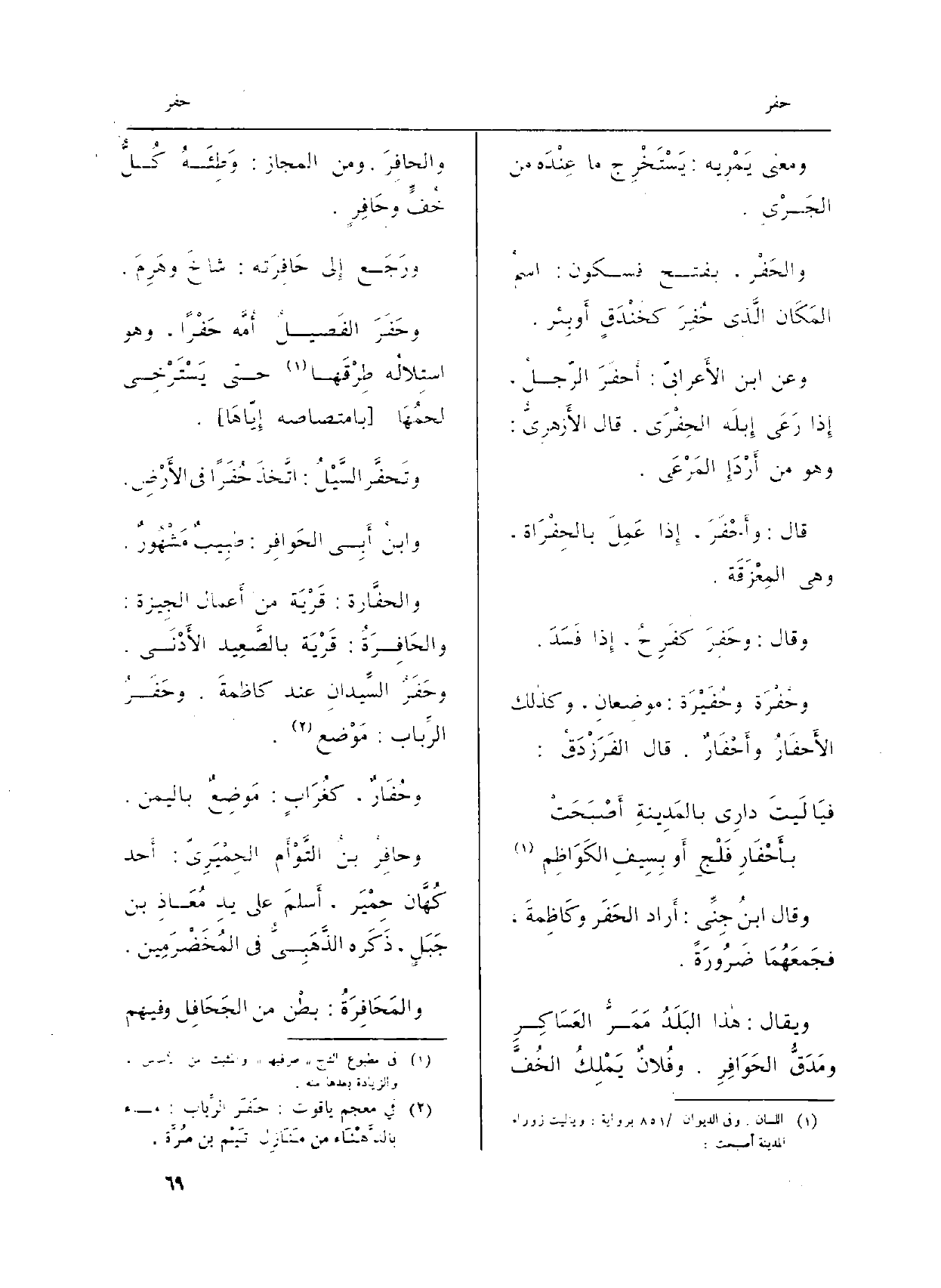 والحفَّارة: قَرْيَة من أَعمال الجِيزة: والحَافِرَةُ: قَرْيَة بالصَّعِيد الأَدْنَى. وحَفَرُ السِّيدانِ عِنْد كاظمةَ. وحَفَرُ الرِّباب: مَوْضع.