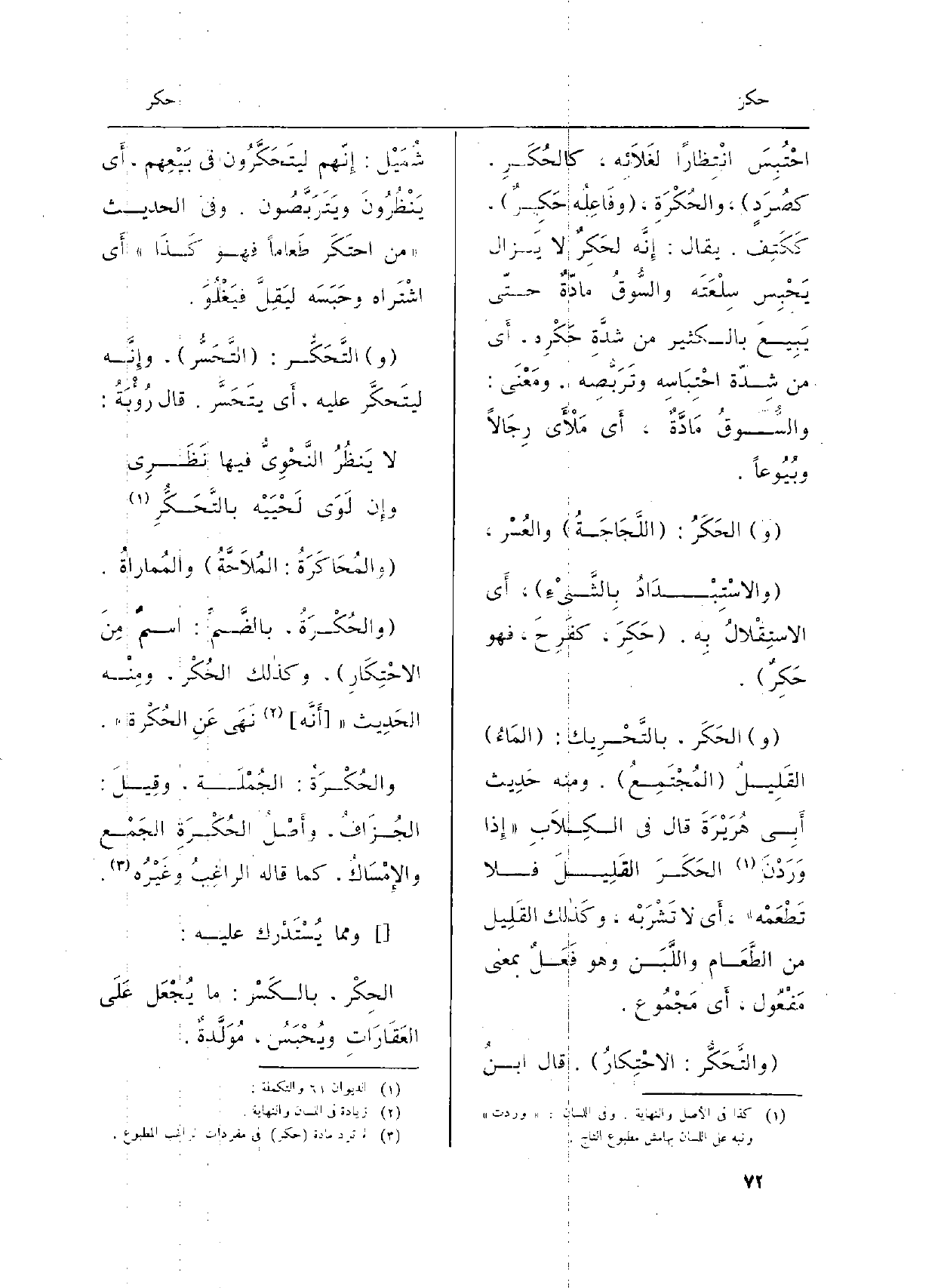 احْتُبِسَ انْتِظاراً لغَلاَئِهِ، كالحُكَرِ، كصُرَدٍ) ، والحُكْرَةِ، (وَفاعِلُه حَكِرٌ) كَكَتِف. يُقَال: إِنَّه لحَكِرٌ لَا يَزال يَحْبِس سِلْعَتَه والسُّوقُ مادّةٌ حتّى يَبِيعَ بالكثير من شدَّةِ حَكْرِه، أَي من شِدّة احْتِبَاسِه وتَرَبُّصِه. ومَعْنَى: والسُّوقُ مَادَّةٌ، أَي مَلْأَى رِجَالاً وبُيُوعاً.