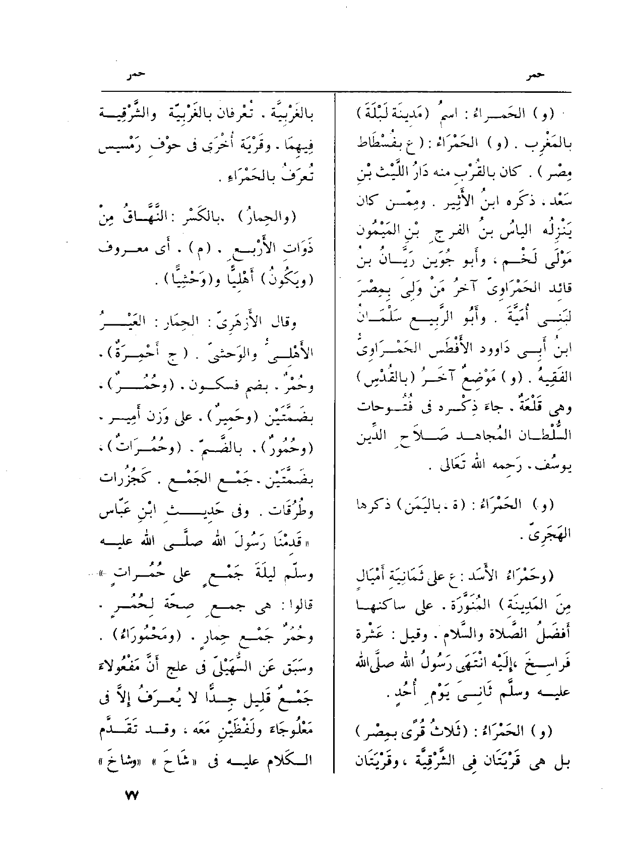 وَقَالَ الأَزهَرِيّ: الحِمَار: العَيْرُ الاِلِيُّ والوَحشيّ. (ج أَحْمِرَةٌ) ، وحُمْرٌ، بِضَم فَسُكُون، (وحُمُرٌ) ، بضَمَّتَيْن (وحَمِيرٌ) ، على وَزن أَمءَهر، (وحُمُورٌ) ، بالضَّمّ، (وحُمُرَاتٌ) ، بضَمَّتَيحٌّ، جَمْع الجَمْع. كَجُزُرات وطُرُقَات. وَفِي حَدِيثِ ابْنِ عَبّاس (قَدِمْنَا رَسُولَ الله صلى الله عَلَيْهِ وسلمليلَةَ جَمْعٍ على حُمُراتٍ) قَالُوا: هِيَ جمعِ صِحّة لِحُمُرٍ، وحُمُرٌ جَمْع حِمارٍ، (وَمَحْمُورَاءُ) ، وسَبَقَ عَن السُّهَيْليّ فِي علج أَنَّ مَفْعُولاءَ جَمْعٌ قَلِيل جِدًّا لَا يُعرَفُ إِلاَّ فِي معْلُوجَاءَ ولَفْظَيْنِ مَعَه، وَقد تَقَدَّم الكَلام عَلَيْهِ فِي (شَاحَ) (وشاخَ)