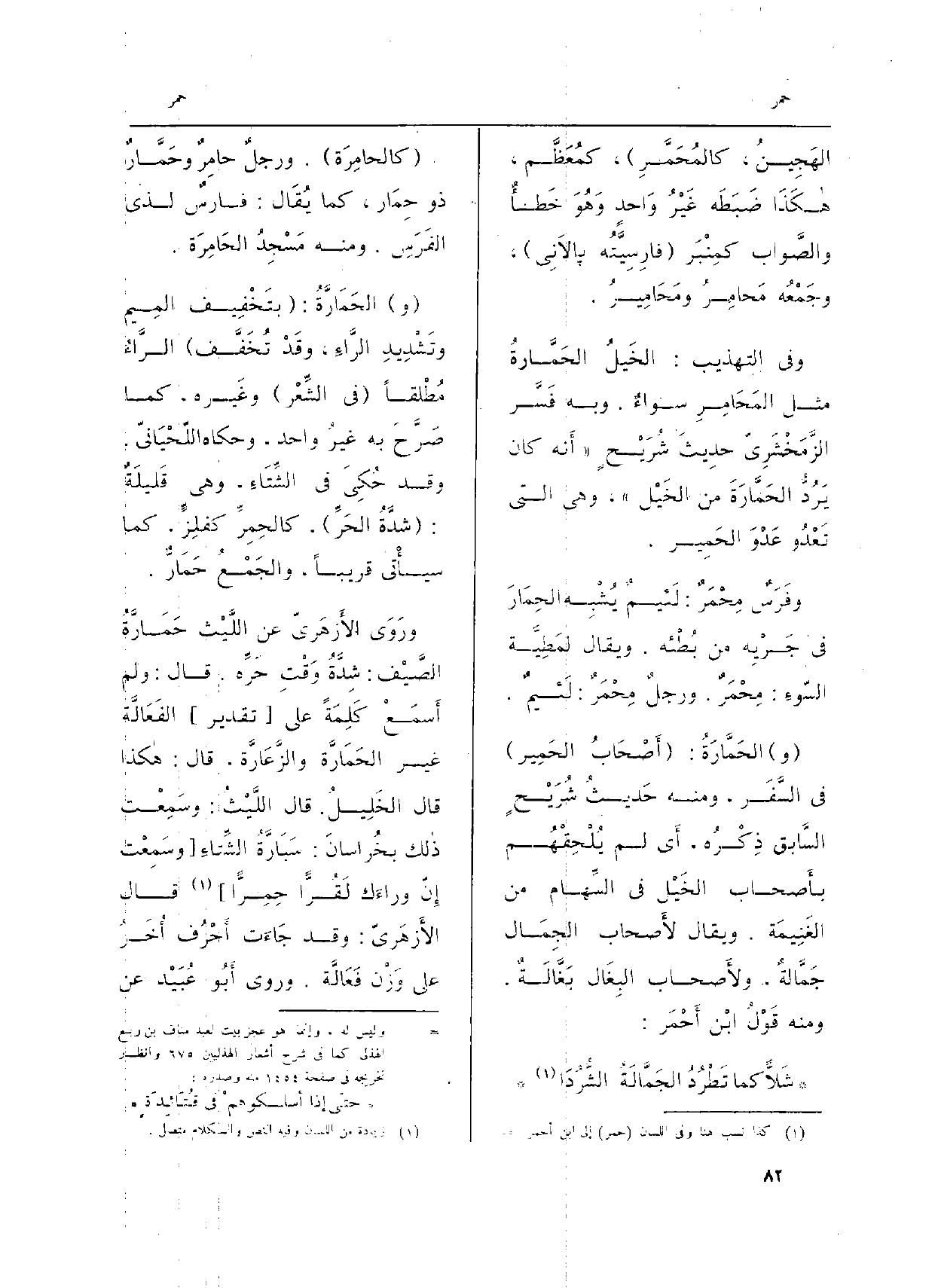 وَفِي التَّهْذِيب: الخَيلُ الحَمَّارةُ مثل المَحَامِرِ سواءٌ. وَبِه فَسَّر الزَّمَخْشَرِيّ حدِيثَ شُرَيْحٍ (أَنَّه كَانَ يَرُدُّ الحَمَّارَةَ من الخَيْل) ، وَهِي الَّتِي تَعْدُو عَدْوَ الحَمِير.