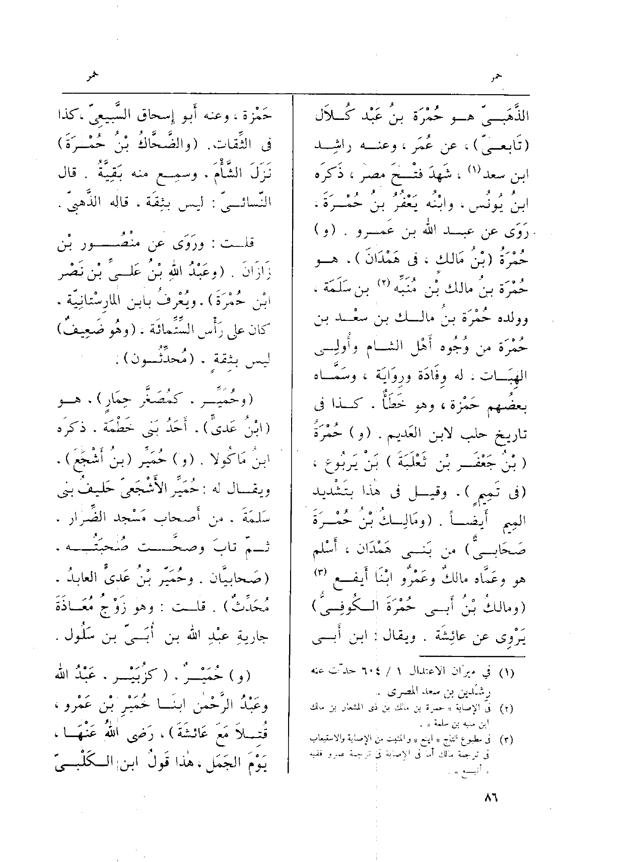 الذَّهَبيّ هُوَ حُمْرَة بنُ عَبْد كُلاَل (تَابعيّ) ، عَن عُمَر، وَعنهُ راشِد ابْن سعد، شَهدَ فتْحَ مصر، ذَكرَه ابنُ يُونُس، وابْنُ يَعْفُرُ بنُ حُمْرَةَ، رَوَى عَن عبد الله بن عَمرو. (و) حُمْرَةُ (بْنُ مَالكٍ، فِي هَمْدَانَ) ، هُوَ حُمْرَة بنُ مَالك بْن مُنَبِّه بن سَلَمَة، وَولده حُمْرَة بنُ مَالك بن سعْد بن حُمْرَة من وُجُوه أَهْل الشَّام وأُولِي الهِبَات، لَهُ وِفَادَة ورِوَايَة، وسَمَّاه بعضُهم حَمْزة، وَهُوَ خَطَأٌ، كَذَا فِي تَارِيخ حلب لِابْنِ العَديم. (و) حُمْرَةُ (بْنُ جَعْفَر بْن ثَعْلَبَةَ) بَنْ يَربُوع، (فِي تَمِيمٍ) ، وَقيل فِي هاذا بتَشْديد المِيم أَيضاً. (ومَالِكُ بْنُ حُمْرَةَ صَحَابيٌّ) من بَني هَمْدَان، أَسْلم هُوَ وعَمَّاه مالكٌ وَعَمْرٌ وابْنَا أَيفع (ومالكُ بنُ أَبي حُمْرَةَ الكُوفِيُّ) يَرْوِي عَن عائِشَة. وَيُقَال: ابْن أَبي حَمْزة، وَعنهُ أَبو إِسحاق السَّبِيعِيّ، كَذَا فِي الثِّقات. (والضَّحَّاكُ بْنُ حُمْرَةَ) نَزَلَ الشَّأْمَ، وسمِع مِنْهُ بَقِيَّةُ. قَالَ النّسائيّ: لَيْسَ بثِقَة، قَالَه الذَّهبيّ.