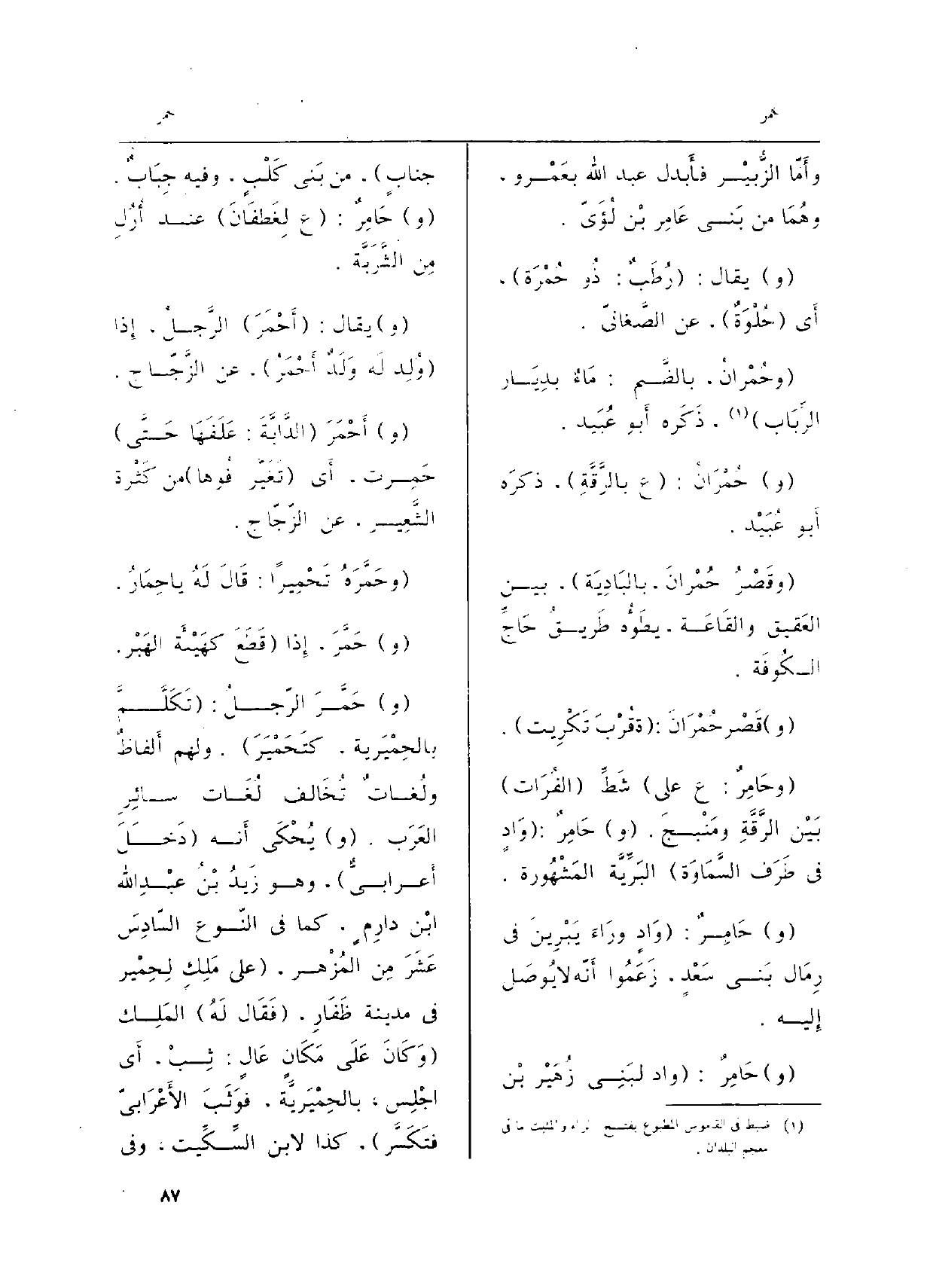 (وحَامِرٌ: ع على) شَطِّ (الفُرَات) بَيْن الرَّقَّةِ ومَنْبجَ. (و) حَامِرٌ: (وَادٍ فِي طَرَف السَّمَاوَة) البَرِّيَّة المَشْهُورة.