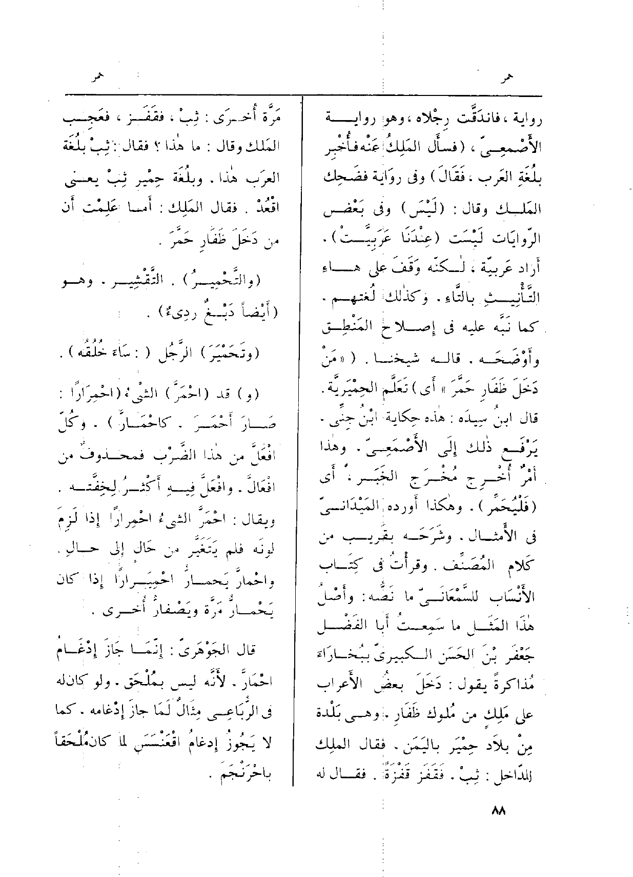 رِوَايَة، فاندَقَّت رِجْلاه، وَهُوَ رِوَايَة الأَصْمَعِيّ، (فسأَل المَلِكُ عَنْه فأُخْبِر بِلُغَةِ العَرَب، فَقَالَ) وَفِي روَاية فَضَحِك المَلك وَقَالَ: (لَيْسَ) وَفِي بَعْض الرّوايَات لَيْسَت (عِنْدَنَا عَرَبِيَّتْ) ، أَراد عَربيّة، لاكنّه وَقَفَ على هاءِ التَّأْنِيثِ بالتَّاءِ، وكذالك لُغتهم، كَمَا نَبَّه عَلَيْهِ فِي أَصلاح امَنْطِق وأَوْضَحَه، قَالَه شَيخنَا. ((مَنْ دَخَلَ ظَفَارِ حَمَّرَ) أَي) تَعَلَّم الحِمْيَرِيَّة. قَالَ ابنُ سِيدَه: هاذه حِكياة ابْنُ جِنِّي، يَرْفَع ذالك إِلَى الأَصْمَعِيّ، وهاذا أَمْرٌ أُخْرِج مُخْرَج الخَبَر، أَي (فَلْيُحَمِّر) ، وهاكذا أَورده المَيْدَانيّ فِي الأَمثال، وشَرَحَه بقَريب من كَلام المُصَنِّف. وقرأْتُ فِي كِتاب الأَنْساب للسَّمْعَانَيّ مَا نَصُّه: وأَصْلُ هاذَا المَثَل مَا سَمِعتُ أَبا الفَضْل جَعْفَر بْنَ الحَسَن الكبيريّ ببُخارَاءَ مُذاكرةً يَقُول: دَخَلَ بعضُ الأَعراب على مَلِكٍ من مُلوك ظَفَارِ، وَهِي بَلْدة مِنْ بلاَد حِمْيَر باليَمَن، فَقَالَ الملِك الدّاخل: ثِبْ، فَقَفَز قَفْزَةً. فَقَالَ لَهُ مَرَّة أُخرَى: ثِبْ، فقَفَز، فعَجِب المَلك وَقَالَ: مَا هاذا؟ فَقَالَ: تِبْ بلُغَة العرَب هاذا، وبلُغَة حِمْير ثِبْ يَعْنِي اقْعُدْ. فَقَالَ المَلِك: أَما عَلِمْت أَن من دَخَلَ ظَفَارِ حَمَّرَ.
