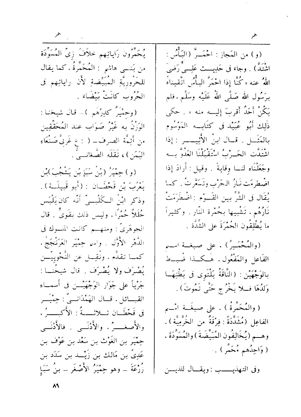 وَفِي التَّهْذِيب: وَيُقَال للَّذين يُحَمِّرُون رَاياتِهم خلاَفَ زِيّ المُسَوِّدَة من بَني هَاشم: المُحَمِّرةُ، كَمَا يُقَال للحَرُورِيَّةِ المُبَيِّضةِ لأَن راياتِهم فِي الحُرُوب كانَتْ بَيْضَاءَ.