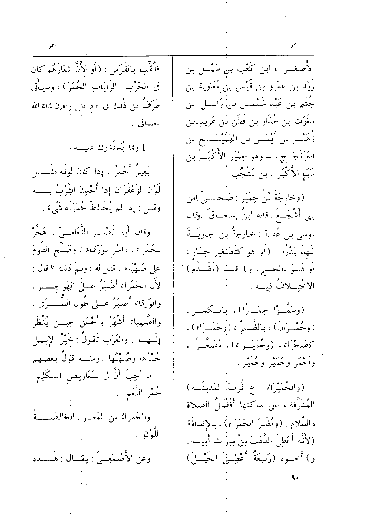 وَقَالَ أَبو نَصْر النَّعَاميّ: هَجِّرْ بحَمْراءِ، واسْرِ بوَرْقَاءَ، وصَبِّح القَومَ على صَهْبَاءَ. قيل لَهُ: ولمَ ذالك؟ قَالَ: لأَن الحَمْراءَ أَصْبَرُ على الهَواجِر، والوَرقاءَ أَصبَرُ على طُول السُّرَى، والصَّهباءَ أَشْهَرُ وأَحْسَن حِين يُنْظَر إِلَيِا. والعَرَب تَقولُ: خَيْرُ الإِبل حُمْرُها وصُهْبُها. وَمِنْه قولُ بَعضهم: مَا أُحِبُّ أَنَّ لي بمَعَاريضِ الكَلِمِ حُمْرَ النَّعَم.