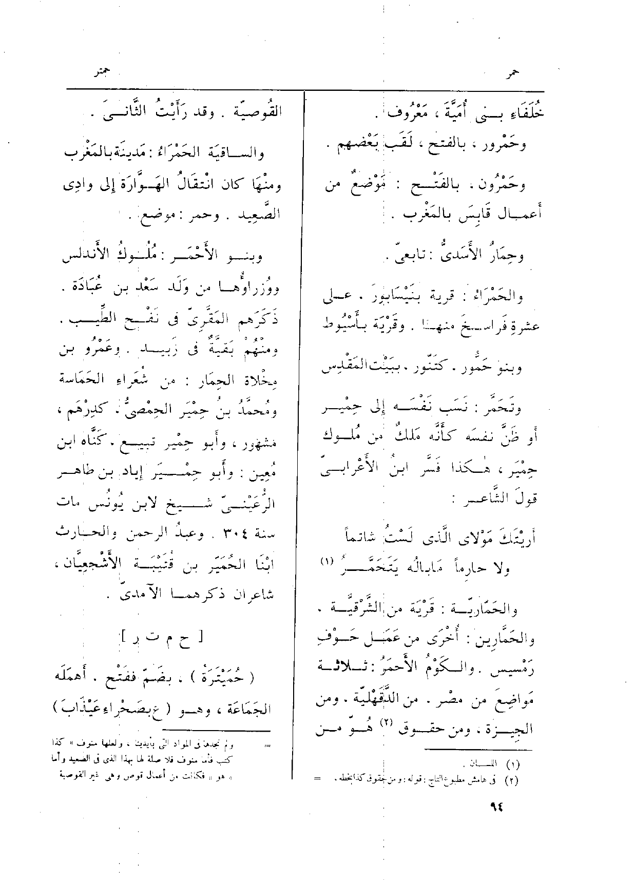 وَبَنُو الأَحْمَر: مُلُوكُ الأَندلس ووُزراؤها من وَلَد سَعْد بن عُبَادَة. ذَكَرَهم المَقَّرِيّ فِي نَفْح الطِّيب. ومنْهُمْ بَقيَّةٌ فِي زَبيد. وعَمْرُو بن مُخْلاة الح 2 ار: من شُعَراءِ الحَمَاسة ومُحمَّدُ بنُ حِمْيَر الحِمْصيُّ، كدِرْهَم، مَشْهُور، وأَبو حِير تبيع، كَنَّاه ابْن مُعِين: وأَبو حِمْيَر إِياد بن طَاهِر الرُّعَيْنيّ شيخ لِابْنِ يُونُس مَاتَ سنة 304. وعبدُ الرحمان والْحَارث ابْنَا الحُمَيْر بن قُتَيْبَة الأَشْجِعِيَّان، شاعران ذكرهمَا الآمديّ.