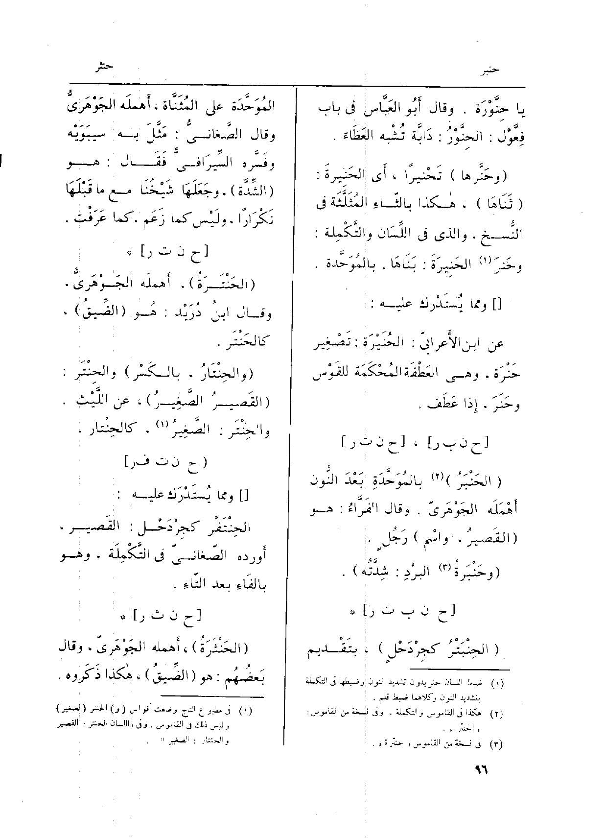 (والحِنْتَارُ، بالكَسْر) والحِنْتَر: (القَصيرُ الصَّغِيرُ) ، عَن اللَّيْث. والحِنْتَر: الصَّغِيرُ، كالحِنْتَار.
