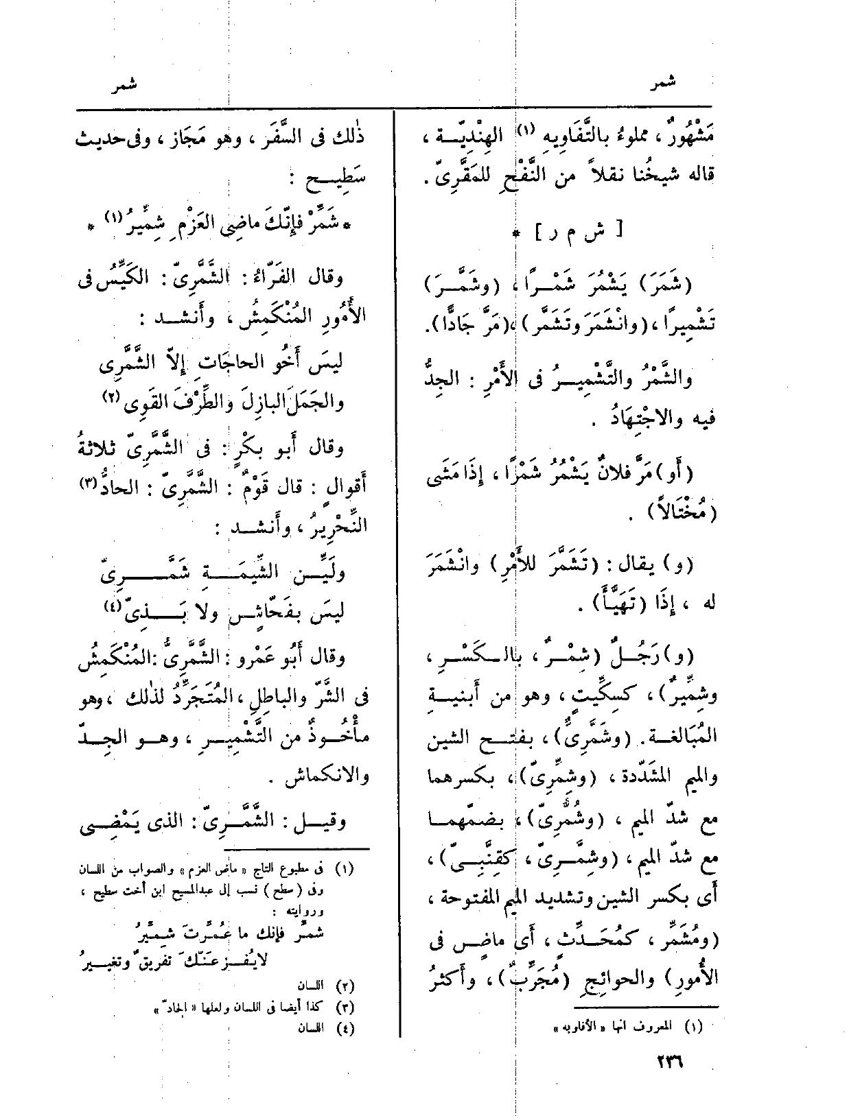 : (شَمَرَ) يَشْمُرَ شَمْراً، (وشَمَّرَ) تَشْمِيراً، (وانْشَمَرَ وتَشَمَّر) ، (مَرَّ جَادّاً) .