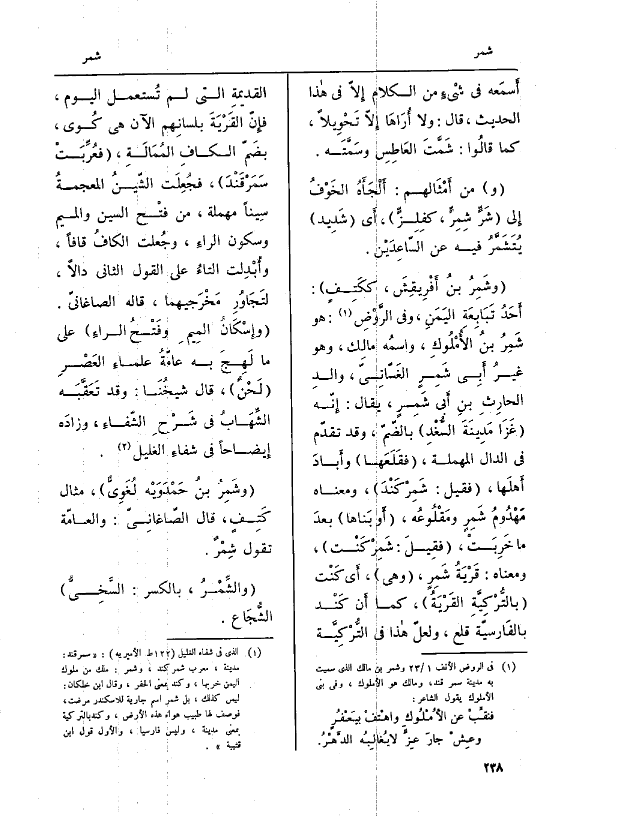 (وشَمِرُ بنُ أَفْرِيقِشَ، ككَتِفٍ) : أَحَدُ تَبابِعَةِ اليَمَنِ، وَفِي الرَّوْضِ: هُوَ شَمِرُ بنُ الأُمْلُوكِ، واسمُه مالِك، وَهُوَ غيرُ أَبِي شَمِرٍ الغَسّانِيّ، والدِ الحارِثِ بنِ أَبي شَمِرٍ، يُقَال: إِنّه (غَزَا مَدِينَةَ السُّغْدِ) بالضّمّ، وَقد تقدّم فِي الدَّال الْمُهْملَة، (فقَلَعَها) وأَبادَ أَهلَها، (فَقيل: شَمِرْكَنْدَ) ، وَمَعْنَاهُ مَهْدُومُ شَمِرٍ ومَقْلُوعُه، (أَو بَناها) بعدَ مَا خَرِبَتْ، (فقيلَ: شَمِرْكَنْت) ، وَمَعْنَاهُ: قَرْيَةُ شَمِرٍ، (وَهِي) ، أَي كَنْت (بالتُّرْكِيَّة القَرْيَةُ) ، كَمَا أَن كَنْد بالفَارسيّة قلع، ولعلّ هاذا فِي التُّرْكِيَّة القديمةِ الَّتِي لم تُستعمل الْيَوْم، فإِنّ القَرْيَةَ بلسانِهم الْآن هِيَ كُوى، بضَمّ الكافِ المُمَالَةِ، (فعُرِّبَتْ سَمَرْقَنْدَ) ، فجُعِلَت الشّينُ المعجمةُ سيِيناً مُهْملَة، من فتْح السِّين وَالْمِيم وَسُكُون الراءِ، وجُعلت الكافُ قافاً، وأُبْدِلت التاءُ على القَوْل الثَّانِي دَالا، لتَجَاوُرِ مَخْرَجيهما، قَالَه الصاغانيّ. (وإِسْكَانُ المِيمِ وفَتْحُ الراءِ) على مَا لَهِجَ بِهِ عامّةُ علماءِ العَصْرِ (لَحْنٌ) ، قَالَ شيخُنَا: وَقد تَعَقَّبَه الشِّهَابُ فِي شَرْحِ الشِّفاءِ، وزادَه إِيضاحاً فِي شفاءِ الغليل.