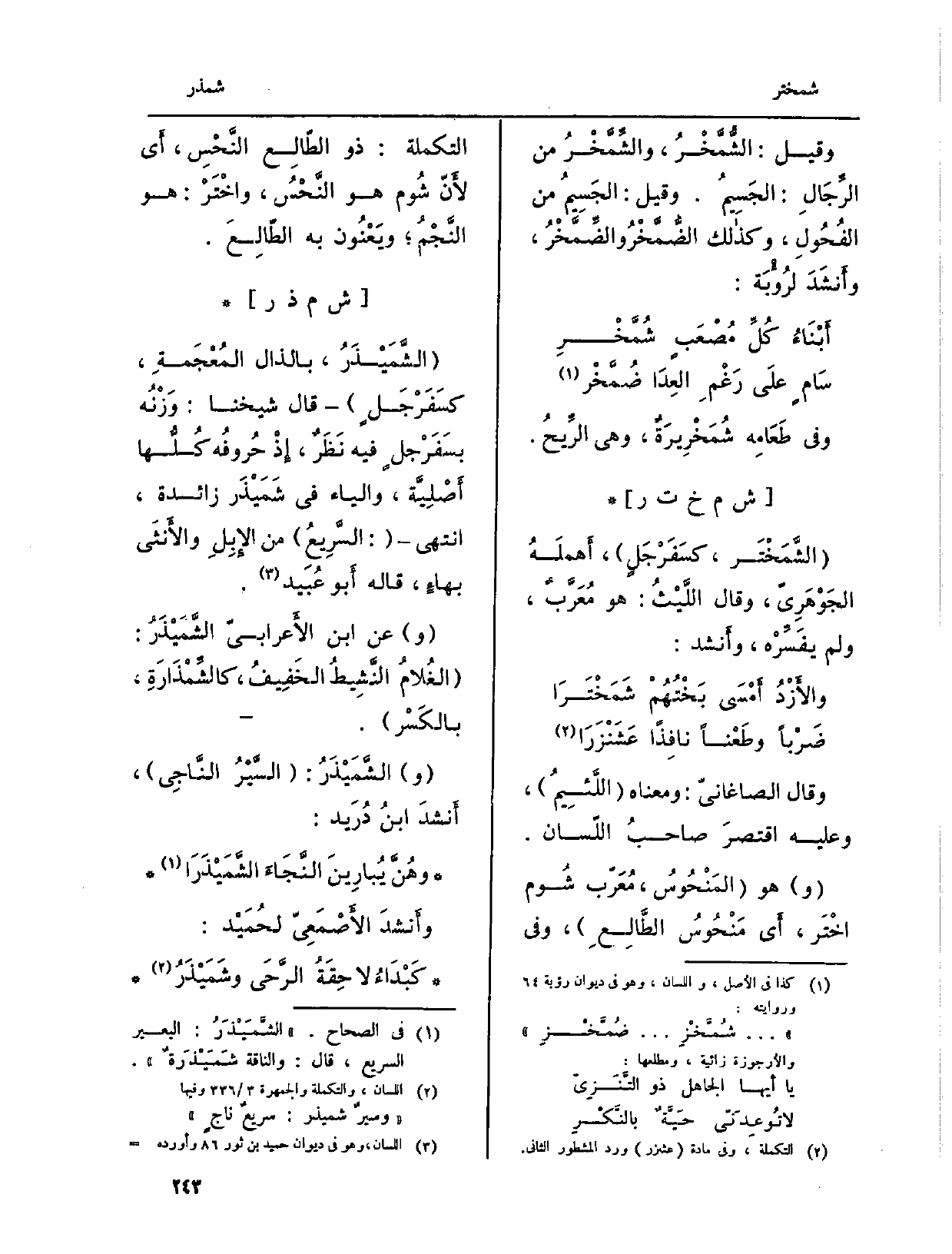 وَقيل: الشُّمَّخْرُ، والشِّمَّخْرُ من الرِّجَالِ: الجَسِيمُ. وَقيل: الجَسِيمُ من الفُحُولِ، وكذالك الضُّمَّخْرُ والضِّمَّخْرُ، وأَنشَدَ لرُؤْبَة:
