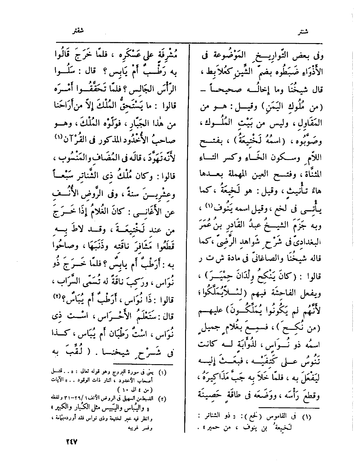 وَفِي بعض التّوارِيخِ المَوْضُوعة فِي الأَذْوَاءِ ضَبَطُوه بضمّ الشِّينِ كعُلاَبِط، قَالَ شيخُنَا وَمَا إِخالُه صَحِيحا (من مُلُوكِ اليَمَنِ) وَقيل: هُوَ من المَقَاوِلِ، وَلَيْسَ من بَيْتِ المُلُوك، وصَوَّبُوه، (اسمُهُ لَخْتِيعَةُ) ، بِفَتْح اللاّمِ وَسُكُون الخَاءِ وَكسر التاءِ المثنَّاة، وَفتح الْعين الْمُهْملَة بعْدهَا هاءٌ تأْنيثٍ، وَقيل: هُوَ لَخِيعَةٌ، كَمَا يأْتِي فِي لخع، وَقيل: اسْمه يَنُوف، وَبِه جَزَمَ الشيخُ عبدُ القَادِرِ بنُ عُمَرَ البغدادِيّ فِي شَرْحِ شَواهدِ الرَّضِيّ، كَمَا قَالَه شيخُنَا والصاغانيّ فِي مَادَّة شتر قَالُوا: (كانَ يَنْكِحُ وِلْدَانَ حِمْيَرَ) ، وَيفْعل الفاحِشَة فيهم (لِئلاّ يُمَلَّكُوا؛ لأَنَّهُم لم يَكُونُوا يُمَلِّكُونَ) عَلَيْهِم (من نُكِحَ) ، فسمِعَ بغُلامٍ جميلٍ اسمُه ذُو نُوَاسٍ، لذُؤَابَةٍ لَهُ كَانَت تَنُوسُ على كَتِفَيْه، فبعَثَ إِليه ليَفْعَلَ بِهِ، فلمّا خَلاَ بِه جَبَّ مَذَاكِيرَهُ، وقطعَ رَأْسَه، ووَضَعَه فِي طاقَةٍ حَصِينَة مُشْرِفَةٍ على عَسْكَرِه، فلمّا خَرَجَ قَالُوا بِهِ رَطْبٌ أَمْ يَابِس؟ قَالَ: سَلُوا الرّأْسَ الجَالِس؟ فلمّا تَحَقَّقُوا أَمْرَه قَالُوا: مَا يَسْتَحِقُّ المُلْكَ إِلاّ من أَرَاحَنا من هاذا الجَبّارِ، فوَلّوْه المُلْكَ، وَهُوَ صاحبُ الأُخْدُود الْمَذْكُور فِي القُرْآن لأنّه تَهَوَّدَ، قالَه فِي المُضَافِ والمَنْسُوب، قَالُوا: وَكَانَ مُلْكُ ذِي الشَّناتِر سَبْعاً وعِشْرِينَ سنة، وَفِي الرَّوْضِ الأُنُفِ عَن الأَغَانِي: كانَ الغُلامُ إِذَا خَرَجَ من عندِ لَخْتِيعَةَ، وَقد لاطَ بِهِ قَطَعُوا مَشَافِرَ ناقَتِه وذَنَبَهَا، وصاحُوا بِهِ: أَرَطْبٌ أَم يابِسٌ؟ فلمّا خَرَجَ ذُو نُوَاس، ورَكِبَ ناقَةً لَهُ تُسَمّى السَّرَاب، قَالُوا: ذَا نُوَاس، أَرَطْبٌ أَم يُبَاسٌ؟ قَالَ: سَتَعْلَمُ الأَحْرَاس، اسْتِ ذِي نُوَاس، اسْتُ رَطْبَان أَم يُبَاس، كَذَا فِي شَرْحِ شَيخنَا. (لُقِّبَ بِهِ