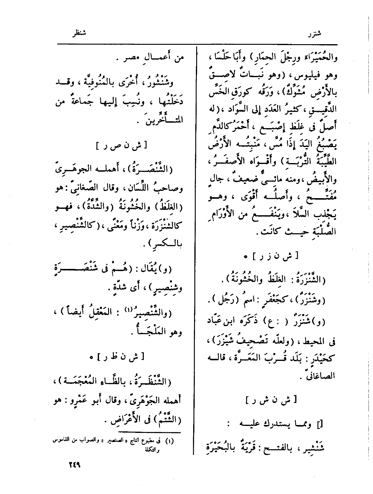 : (الشَّنْصَرَةُ) ، أَهمله الجوهَرِيّ وصاحبُ اللِّسَان، وَقَالَ الصّغانِيّ: هُوَ (الغِلَظُ) والخُشُونَةُ (والشِّدَّةُ) ، فَهُوَ كالشَنْزَرَة، وَزْناً ومَعْنًى، (كالشِّنْصِيرِ، بالكسرِ) .
