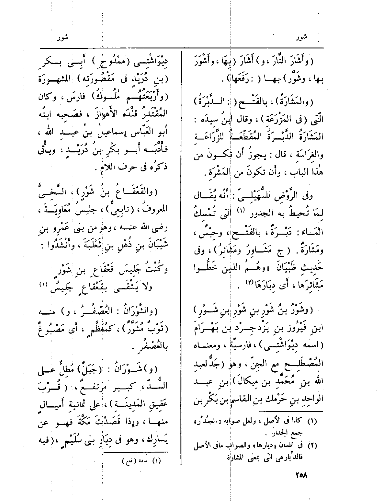 (} وشَوْرُ بنُ {شَوْرِ بنِ شَوْرِ بنِ شَوْرِ) ابنِ فَيْرُوز بنِ يَزْدجِرْد بن بَهْرَامَ (اسْمه دِيْوَاشْتِي) ، فارسيّة، وَمَعْنَاهُ: المُصْطَلِح مَعَ الجِنّ، وَهُوَ (جَدٌّ لعبدِ الله بنِ مُحَمَّدِ بن مِكيالَ) ، بنِ عبد الواحِدِ بنِ حَرْمك بن الْقَاسِم بن بَكْرِ بن دِيْوَاشْتِي (ممْدُوحِ) أَبي بكرِ (بنِ دُرَيْدٍ فِي مَقْصُورَتِه) المشهورَة (وأَرْبَعَتُهُم مُلُوكُ) فارسَ، وَكَانَ المُقْتَدِرُ قلَّدَه الأَهوازَ، فصَحِبه ابنُه أَبو العَبّاس إِسماعيلُ بنُ عبدِ الله، فأَدَّبَه أَبو بكْرِ بنُ دُرَيْدٍ، ويأْتي ذكرُه فِي حرف اللَّام.