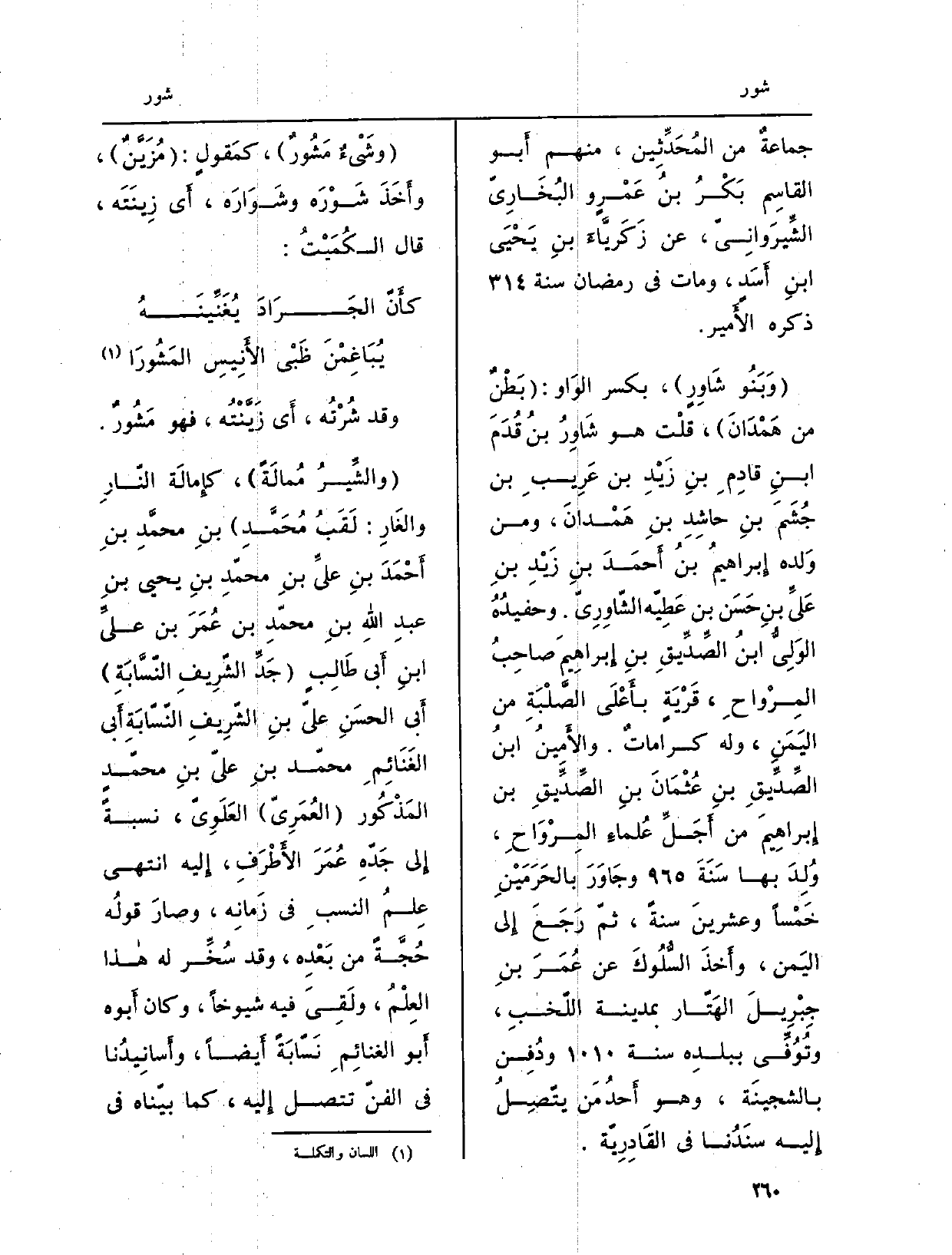 (} والشِّيرُ مُمَالَةً) ، كإِمالَة النّارِ والدَارِ: (لَقَبُ مُحَمَّدِ) بنِ محمَّدِ بنِ أَحْمَدَ بنِ عَليّ بنِ محمّدِ بنِ يحيى بنِ عبدِ الله بنِ محمّد بن عُمَرَ بن عليِّ بنِ أَبي طَالِبٍ (جَدِّ الشَّرِيفِ النَّسَّابَةِ) أَبي الحسَنِ عليّ بنِ الشّرِيفِ النّسّابَةِ أَبي الغَنَائِمِ محمّد بنِ عليّ بنِ محمّدٍ المَذْكُور (العُمَرِيّ) العَلَوِيّ، نِسْبَة إِلى جَدِّهِ عُمَرَ الأَطْرَفِ، إِليه انْتهى عِلمُ النسبِ فِي زَمانِه، وصارَ قولُه حُجَّةً من بَعْدِه، وَقد سُخِّرَ لَهُ هاذا العِلْمُ، ولَقِيَ فِيهِ شُيُوخًا، وَكَانَ أَبوه أَبو الغنائِمِ نَسّابَةً أَيضاً، وأَسانِيدُنا فِي الفنّ تتصل إِليه، كَمَا بيّناه فِي