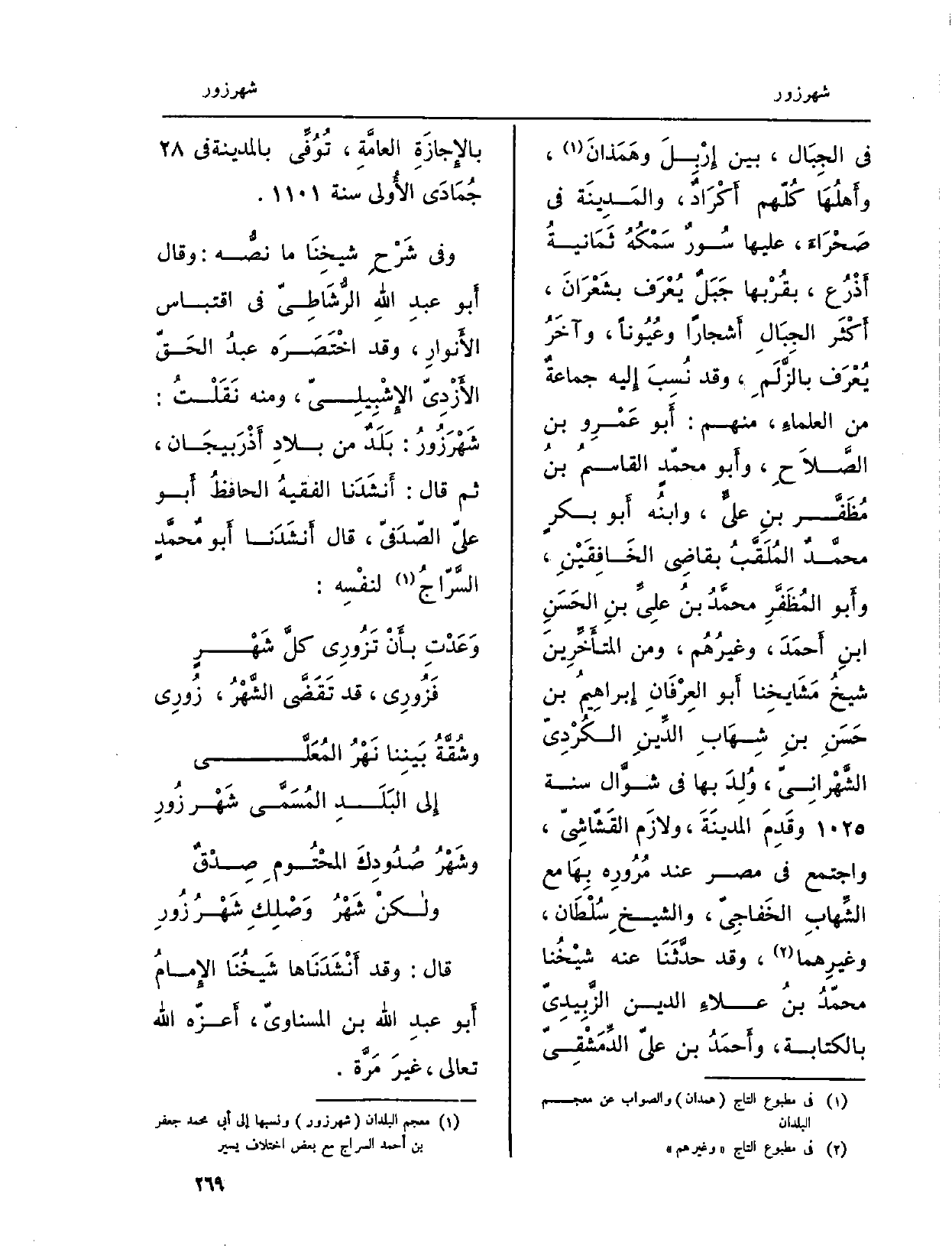 وَفِي شَرْحِ شيخِنَا مَا نصُّه: وَقَالَ أَبو عبدِ اللَّهِ الرُّشَاطِيّ فِي اقتباس الأَنوارِ، وَقد اخْتَصَرَه عبدُ الحقّ الأَزْدِيّ الإِشْبِيلِيّ، وَمِنْه نَقَلْتُ: شَهْرَزُورُ: بَلَدٌ من بِلَاد أَذْرَبيجَان، ثمَّ قَالَ: أَنشَدَنا الفقيهُ الحافظُ أَبو عليّ الصّدَفيّ، قَالَ: أَنشَدنا أَبو مُحمَّدٍ السَّرّاج لنفْسِه: