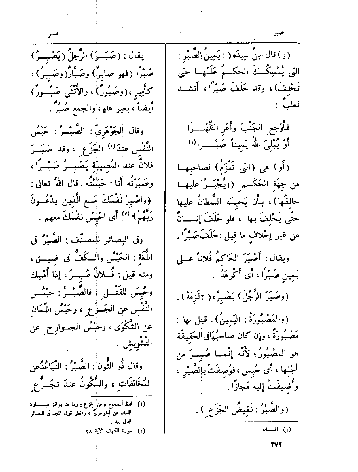 وَقَالَ الجَوْهَرِيّ: الصَّبْرُ: حَبْسُ النَّفْسِ عندَ الجَزَعِ، وَقد صَبَرَ فلانٌ عِنْد المُصِيبَةِ يَصْبِرُ صَبْراً، وصَبَرْتُه أَنا: حَبَسْتُه، قَالَ اللَّهُ تَعَالَى: {وَاصْبِرْ نَفْسَكَ مَعَ الَّذِينَ يَدْعُونَ رَبَّهُم} (الْكَهْف: 28) ، أَي احْبِسْ نفْسَكَ مَعَهم.