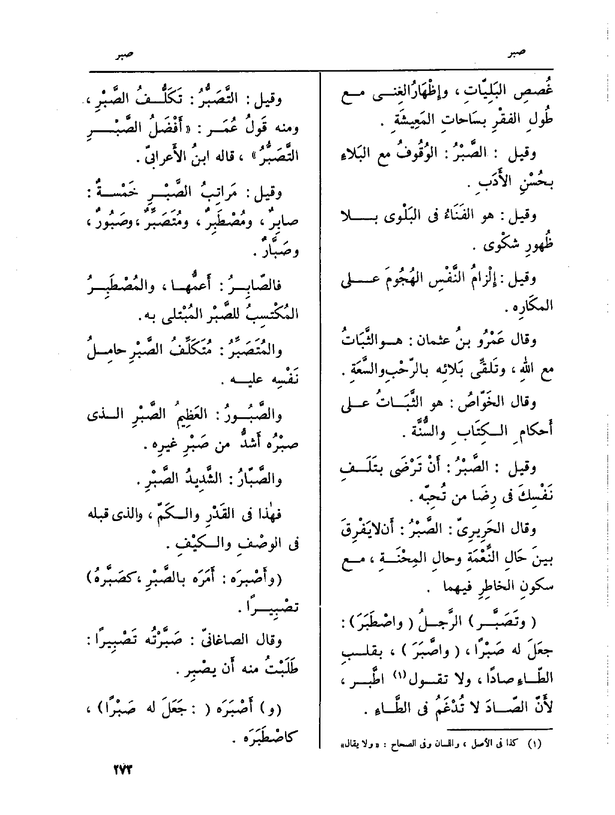 وَقيل: مَراتِبُ الصَّبْرِ خَمْسةٌ: صابِرٌ، ومُصْطَبِرٌ، ومُتَصَبِّرٌ، وصَبُورٌ، وصَبَّارٌ.