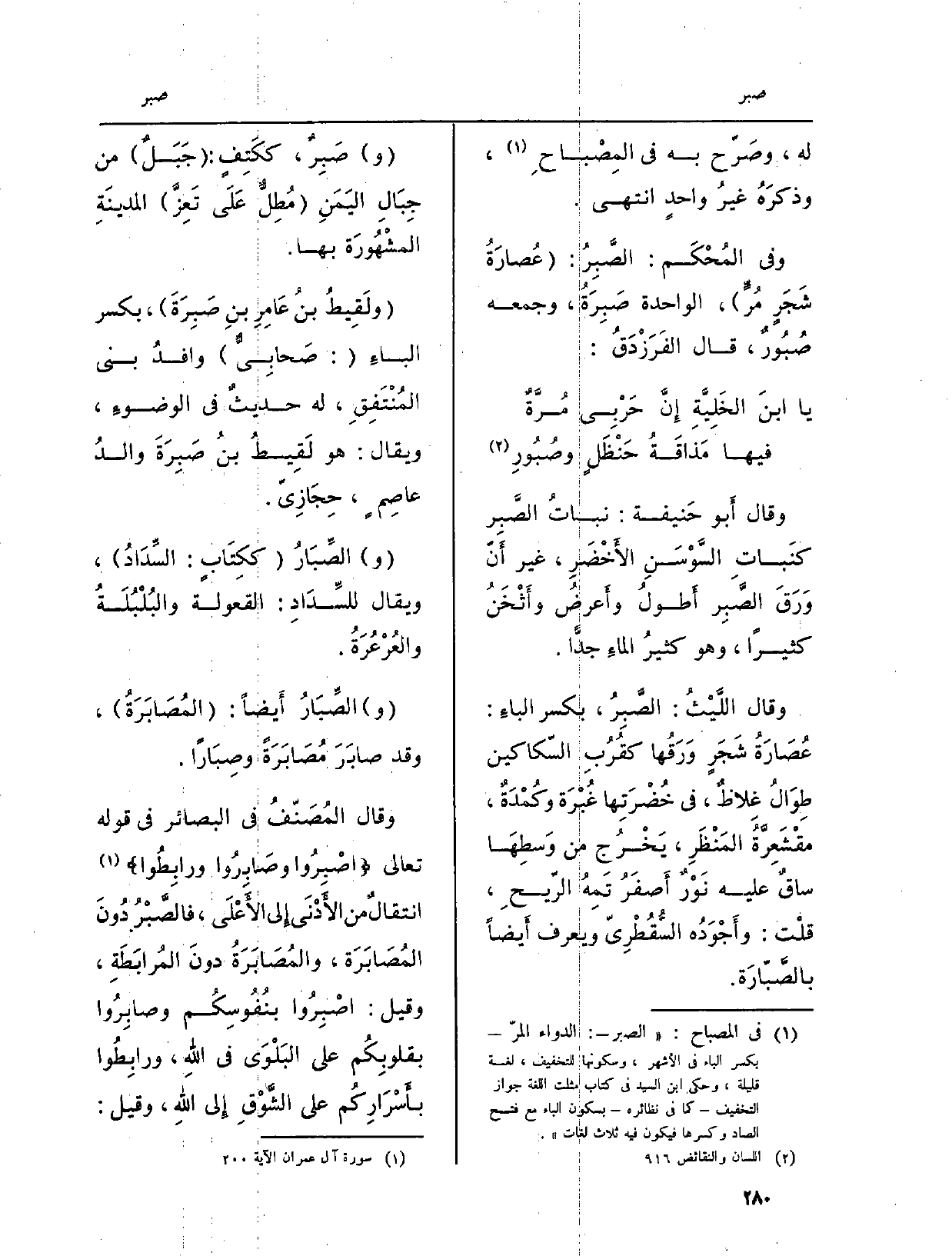وَفِي المُحْكَم: الصَّبِرُ: (عُصارَةُ شَجَرٍ مُرَ) ، الْوَاحِدَة صَبِرَةُ، وَجمعه صُبُورٌ، قَالَ الفَرَزْدَقُ: