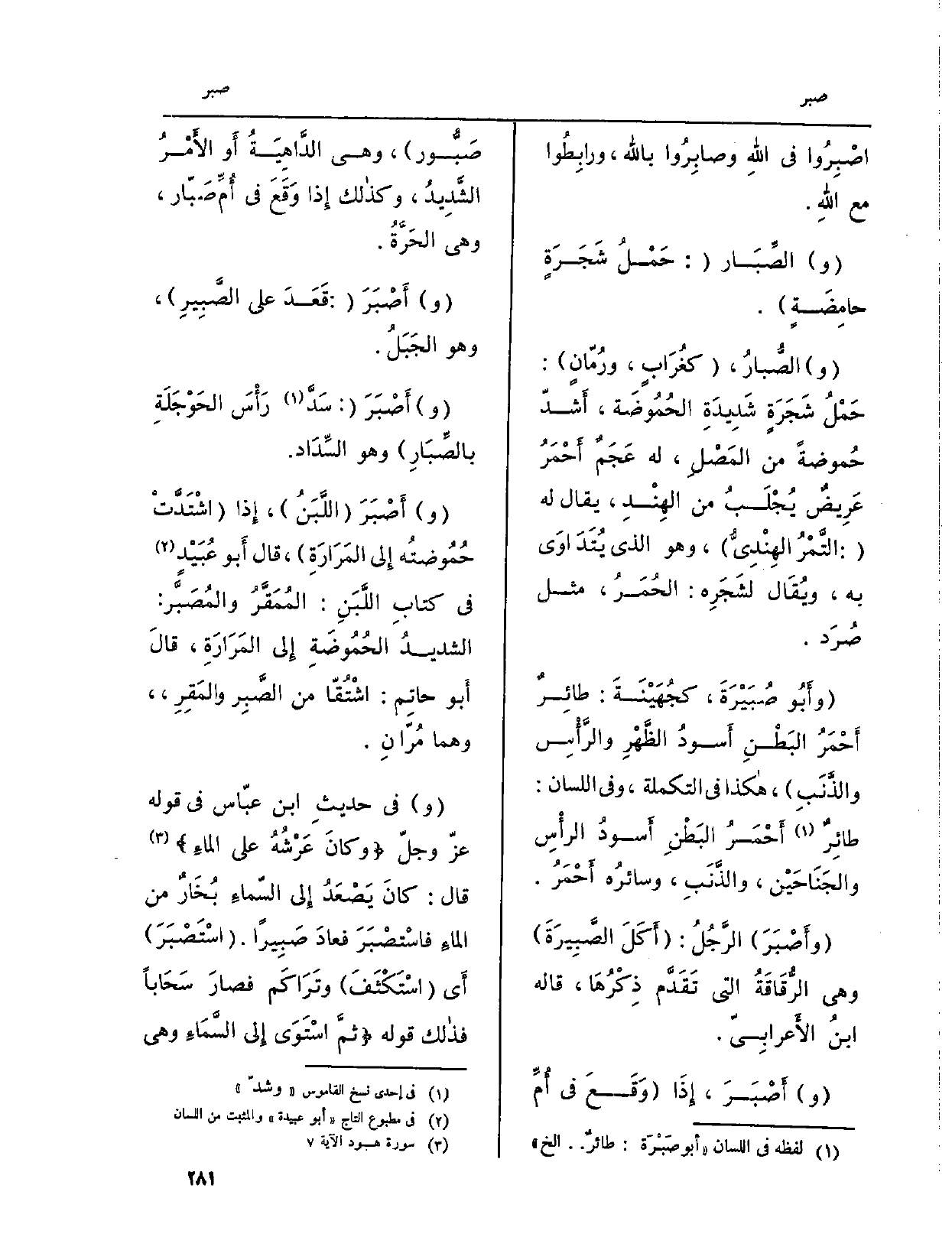 (و) فِي حديثِ ابْن عبّاس فِي قَوْله عزّ وجلّ: {وَكَانَ عَرْشُهُ عَلَى الْمَآء} (هود: 7) ، قَالَ: كانَ يَصْعَدُ إِلى السَّماءِ بُخَارٌ من الماءِ فاسْتَصْبَرَ فعادَ صَبِيراً. (اسْتَصْبَرَ) أَي (اسْتَكْثَفَ) وتَرَاكَم فصارَ سَحَاباً فذالك قَوْله: {ثُمَّ اسْتَوَى إِلَى السَّمَآء وَهِىَ