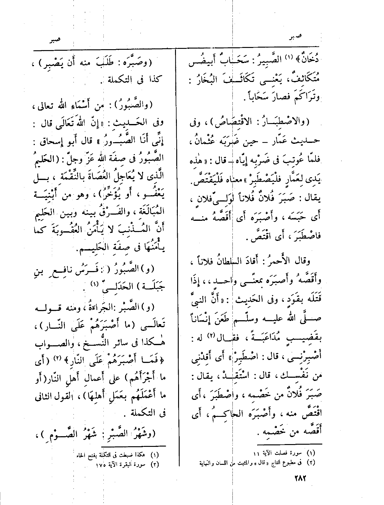 وَقَالَ الأَحمرُ: أَقادَ السلطانُ فلَانا، وأَقَصَّهُ وأَصبَرَه بِمَعْنى واحدٍ، إِذَا قَتَلَه بقَوَدٍ، وَفِي الحَدِيث: (أَنَّ النبيَّ صلى الله عَلَيْهِ وسلمطَعَنَ إِنْسَاناً بقَضِيبٍ مُدَاعَبَةً، فَقَالَ لَهُ: اصْبِرْنِي، قَالَ: اصْطَبِرْ) أَي: أَقِدْنِي من نَفْسِك، قَالَ: اسْتَقِدْ، يُقَال: صَبَرَ فُلانٌ من خَصْمِه، واصْطَبَرَ، أَي اقْتَصَّ مِنْهُ، وأَصْبَرَه الحاكِمُ، أَي أَقَصَّه من خَصْمِه.