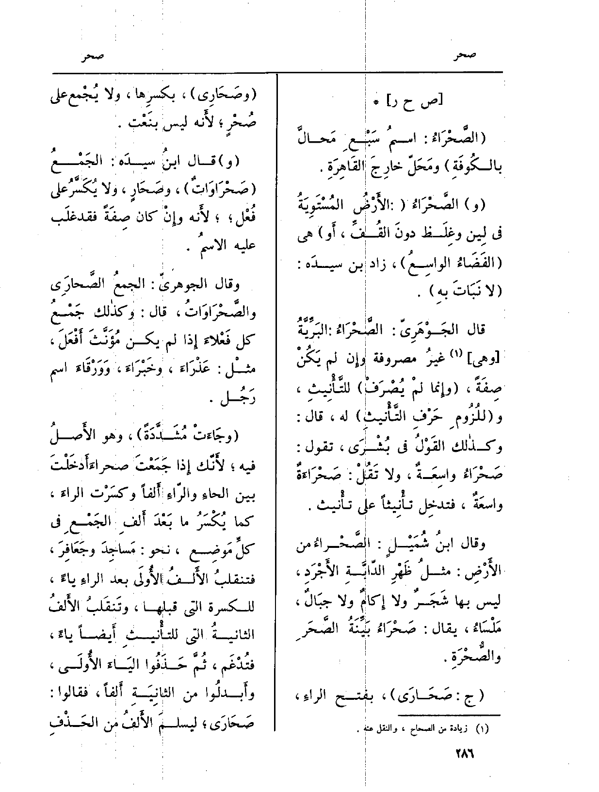 قَالَ الجَوْهَرِيّ: الصَّحْرَاءُ: البَرِّيَّةُ وَهِي غيرُ مصروفة وإِن لم يَكُنْ صفَةً، (وإِنما لمْ يُصْرَفْ) للتَّأْنِيثِ، و (للُزُومِ حَرْفِ التَّأْنِيثِ) لَهُ، قَالَ: وكذالك القَوْلُ فِي بُشْرَى، تَقول: صَحْرَاءُ واسِعَةٌ، وَلَا تَقُلْ: صَحْرَاءَةٌ واسعَةٌ، فتدخِل تأْنِيثاً على تأْنيث.