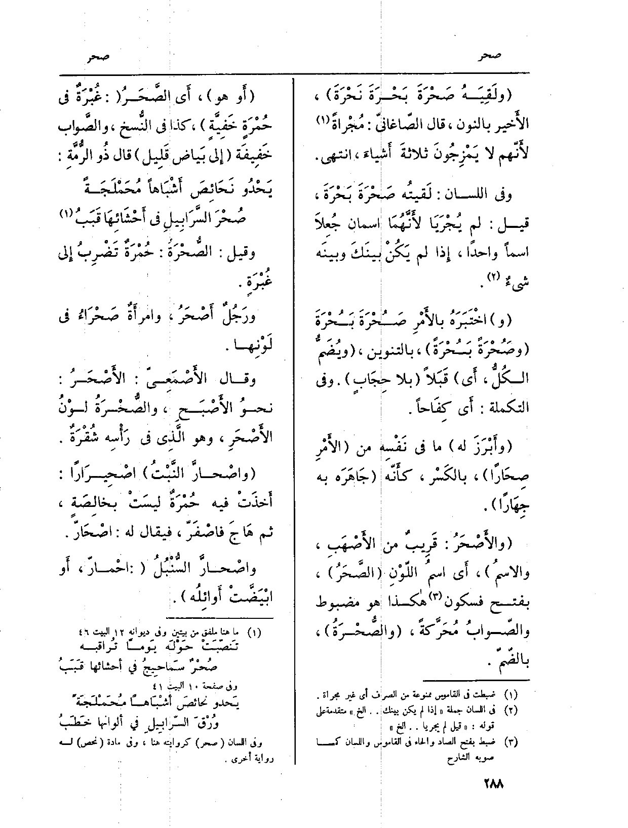 (أَو هُوَ) ، أَي الصَّحَرُ: (غُبْرَةٌ فِي حُمْرَةٍ خَفِيَّةٍ) ، كَذَا فِي النُّسخ، والصَّواب خَفِيفَة (إِلى بَياضٍ قَلِيل) قَالَ ذُو الرُّمَّةِ: