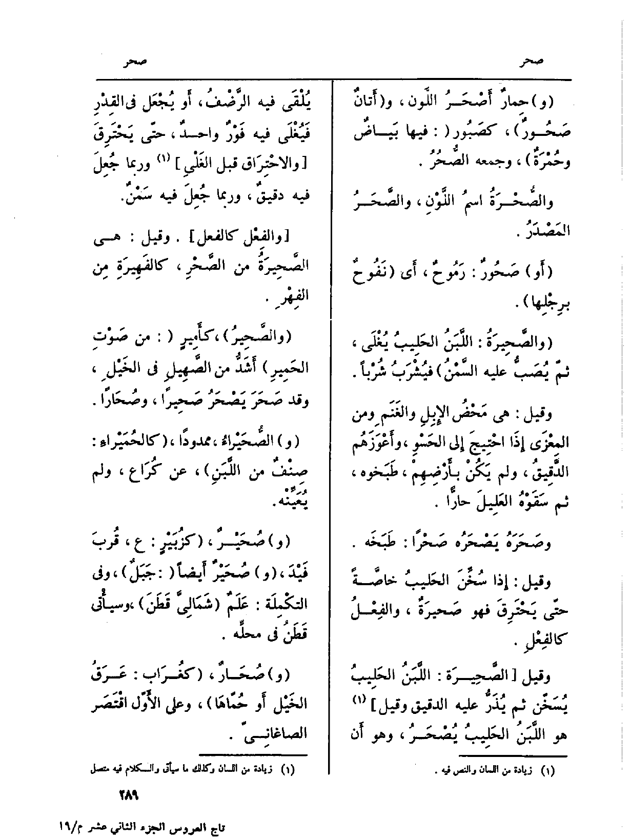 وَقيل: الصَّحِيرَة: اللَّبَنُ الحَلِيبُ يُسَخّن ثمَّ يُذَرُّ عَلَيْهِ الدَّقِيق وَقيل: هُوَ اللَّبَنُ الحَلِيبُ يُصْحَرُ، وَهُوَ أَن يُلْقَى فِيهِ الرَّضْفُ، أَو يُجْعَل فِي القِدْرِ فَيُغْلَى فِيهِ فَوْرٌ واحدٌ، حتّى يَحْتَرِقَ والاحْتِرَاق قبل الغَلْيِ وَرُبمَا جُعِلَ فِيهِ دقيقٌ، وَرُبمَا جُعِلَ فِيهِ سَمْنٌ.
