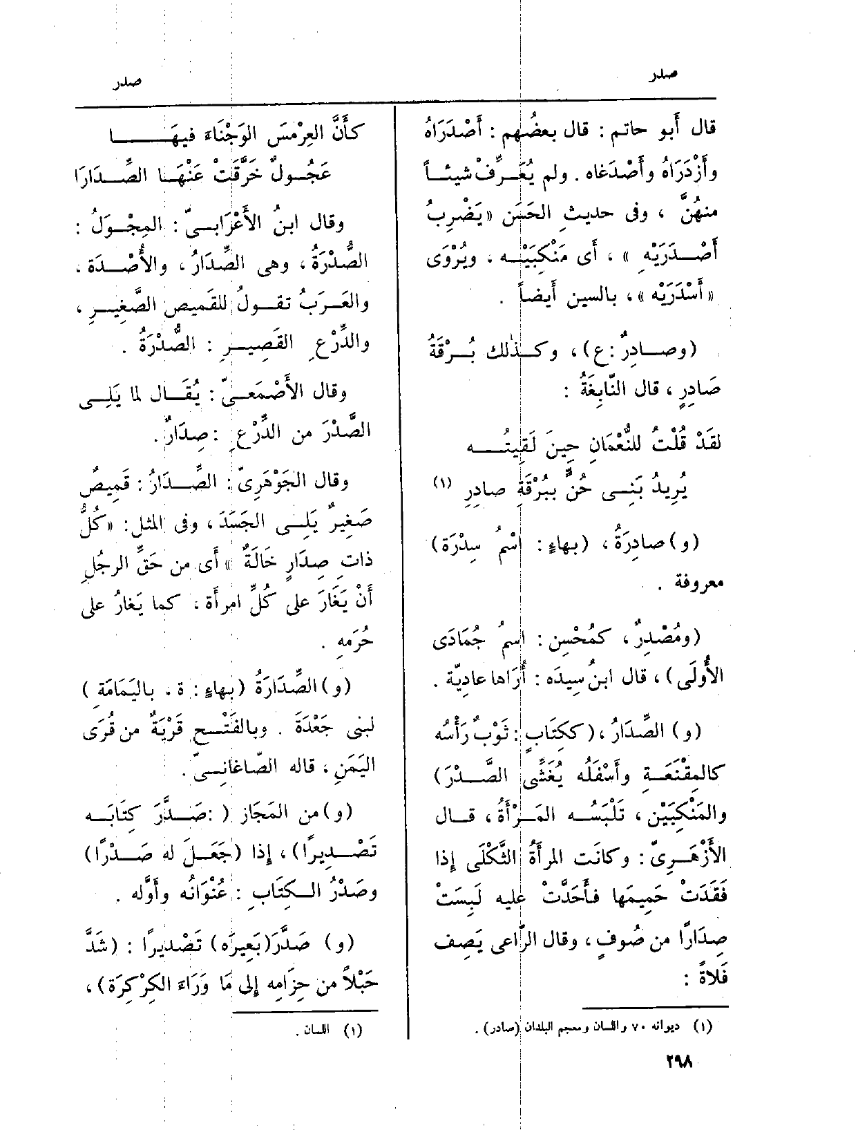 (و) الصِّدَارُ، (ككِتَابٍ: ثَوْبٌ رَأْسُه كالمِقْنَعَةِ وأَسْفَلُه يُغَشِّي الصَّدْرَ) والمَنْكِبَيْن، تَلْبَسُه المَرْأَةُ، قَالَ الأَزْهَرِيّ: وكانَت المرأَةُ الثَّكْلَى إِذا فَقَدَتْ حَمِيمَها فأَحَدَّتْ عَلَيْهِ لَبِسَتْ صِدَاراً من صُوفٍ، وَقَالَ الرّاعي يَصِف فَلاةً: