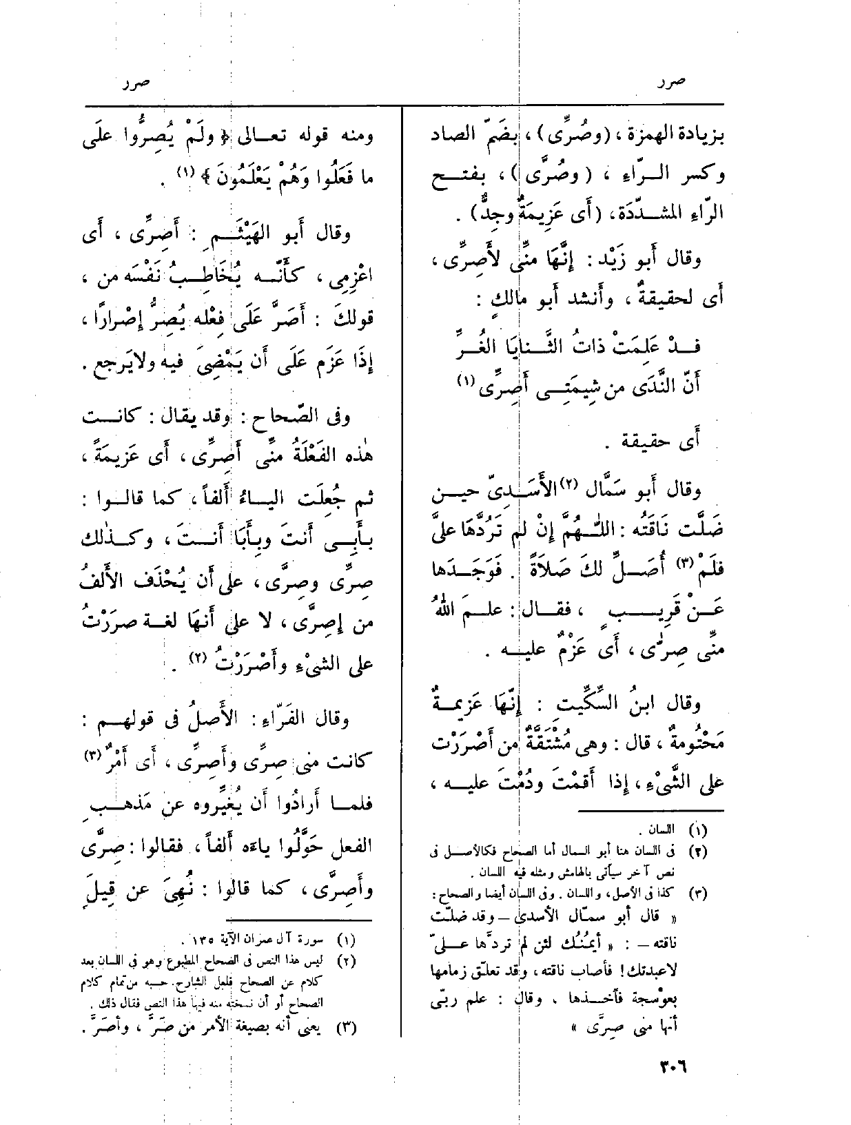 وَقَالَ ابنُ السِّكِّيت: إِنّهَا عَزيمةٌ مَحْتُومةٌ، قَالَ: وَهِي مُشْتَقَّةٌ من {أَصْرَرْت على الشَّيْءِ، إِذا أَقمْتَ ودُمْتَ عَلَيْهِ، وَمِنْه قَوْله تَعَالَى: {وَلَمْ} يُصِرُّواْ عَلَى مَا فَعَلُواْ وَهُمْ يَعْلَمُونَ} (آل عمرَان: 135) .
