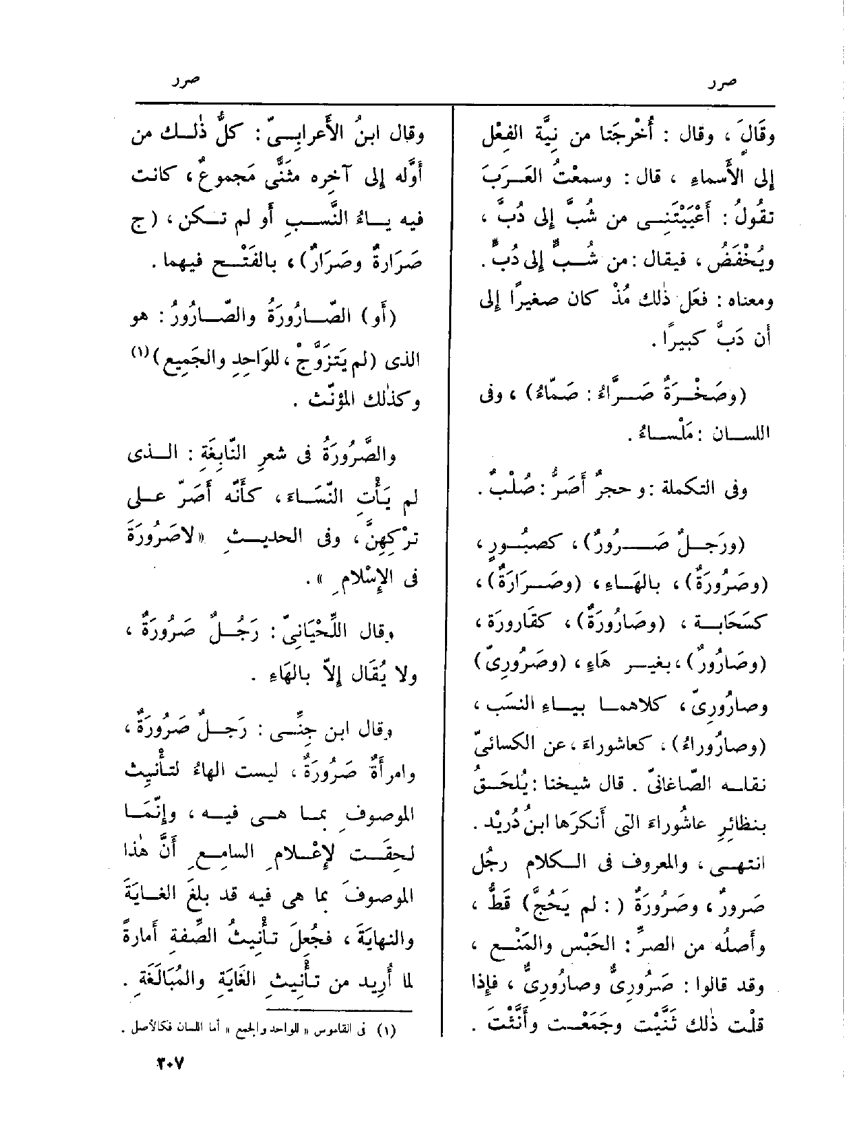 (ورَجلٌ {صَرُورٌ) ، كصبُورٍ، (} وصَرُورَةٌ) ، بالهَاءِ، ( {وصَرَارَةٌ) ، كسَحَابة، (} وصَارُورَةٌ) ، كقَارورَة، ( {وصَارُورٌ) ، بِغَيْر هَاءٍ، (} - وصَرُورِيّ) {- وصَارُورِيّ، كِلَاهُمَا بياءِ النسَب، (} وصارُوراءُ) ، كعاشوراءَ، عَن الكسائيّ نَقله الصّاغانيّ. قَالَ شَيخنَا: يُلحَقُ بنظائِرِ عاشُوراءَ الَّتِي أَنكرَها ابنُ دُريْد. انْتهى. وَالْمَعْرُوف فِي الْكَلَام رجُل {صَرورٌ،} وصَرُورَةٌ: (لم يَحُجَّ) قَطُّ، وأَصلُه من الصرِّ: الحَبْس والمَنْع، وَقد قَالُوا: {- صَرُورِيٌّ} - وصارُورِيٌّ، فإِذا قلْت ذالك ثَنَّيْت وجَمَعْت وأَنَّثْتَ. وَقَالَ ابنُ الأَعرابِيّ: كلُّ ذالك من أَوَّله إِلى آخِره مثَنًّى مَجموعٌ، كَانَت فِيهِ ياءُ النَّسبِ أَو لم تكن، (ج: {صَرَارةٌ} وصَرَارٌ) ، بالفَتْح فيهمَا.