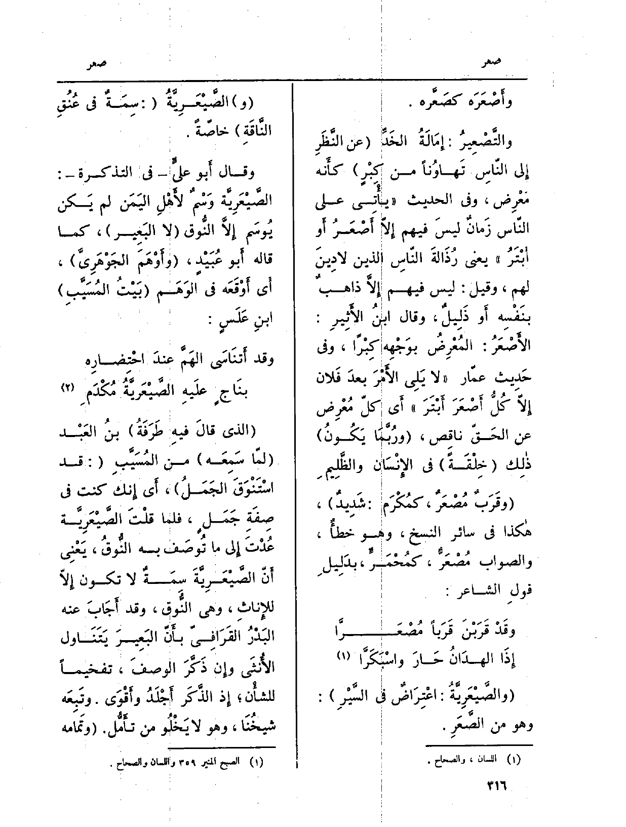 والتَّصْعِيرُ: إِمَالَةُ الخَدِّ (عَن النَّظَرِ إِلى النّاسِ تَهاوُناً من كِبْرٍ) كأَنه معْرِض، وَفِي الحَدِيث: (يأْتِي على النّاس زَمانٌ ليسَ فيهم إِلاّ أَصْعَرُ أَو أَبْتَرُ) يَعْنِي رُذَالةَ النّاسِ الَّذين لَا دِينَ لَهُم، وَقيل: لَيْسَ فيهم إِلاَّ ذاهبٌ بنَفْسِه أَو ذَلِيلٌ، وَقَالَ ابنُ الأَثِيرِ: الأَصْعَرُ: المُعْرِضُ بوَجْهِه كِبْراً، وَفِي حَدِيثِ عمّار: لَا يَلِي الأَمْرَ بعدَ فلَان إِلاّ كُلُّ أَصْعَرَ أَبْتَرَ، أَي كلّ مُعْرِض عَن الحَقّ ناقِص، (ورُبَّما يَكُونُ) ذالِك (خِلْقَةً) فِي الإِنْسَان والظَّلِيمِ.