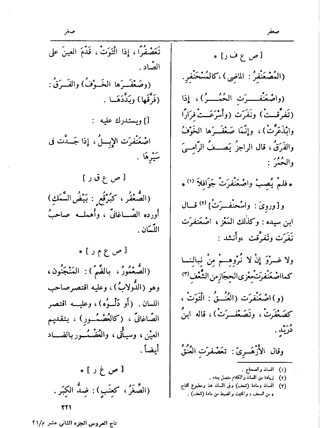 وَقَالَ الأَزْهَرِيّ: تعَصْفرَتِ العُنُقُ تَعَصْفُراً، إِذا الْتَوَتْ، قَدّمَ العينَ على الصّاد.